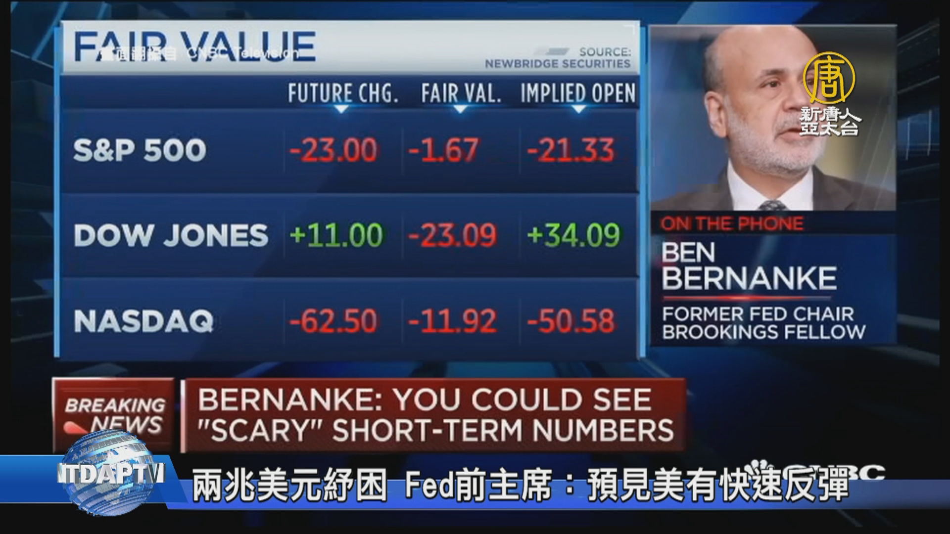 【新唐人亞太台 2020 年 03 月 26 日訊】美國白宮經濟顧問柯德洛25號接受訪問,他表示,美國將會有2兆美元來進行紓困,還有4兆美元給聯準會用來穩定市場。美國聯準會前主席 柏南奇說,這次的衝擊和2008年金融危機不同,可以預見美國會有快速反彈。