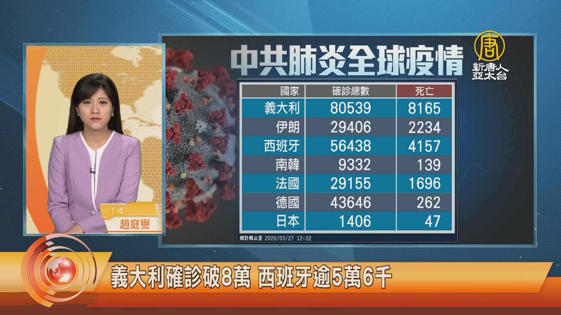 【新唐人亞太台 2020 年 03 月 27 日訊】帶您瀏覽中共肺炎在全球各地的最新災況,歐洲部分,義大利確診病例突破8萬例,死亡8千1百多人。西班牙確診達5萬6千多人、4千1百多人死亡。德國確診也來到4萬3千多例、死亡262人。法國將近3萬例確診、死亡逼近1千7百人。英國新增115人病死,這也是英國首次單日死亡破百,目前中共肺炎已經蔓延到全球176個國家。