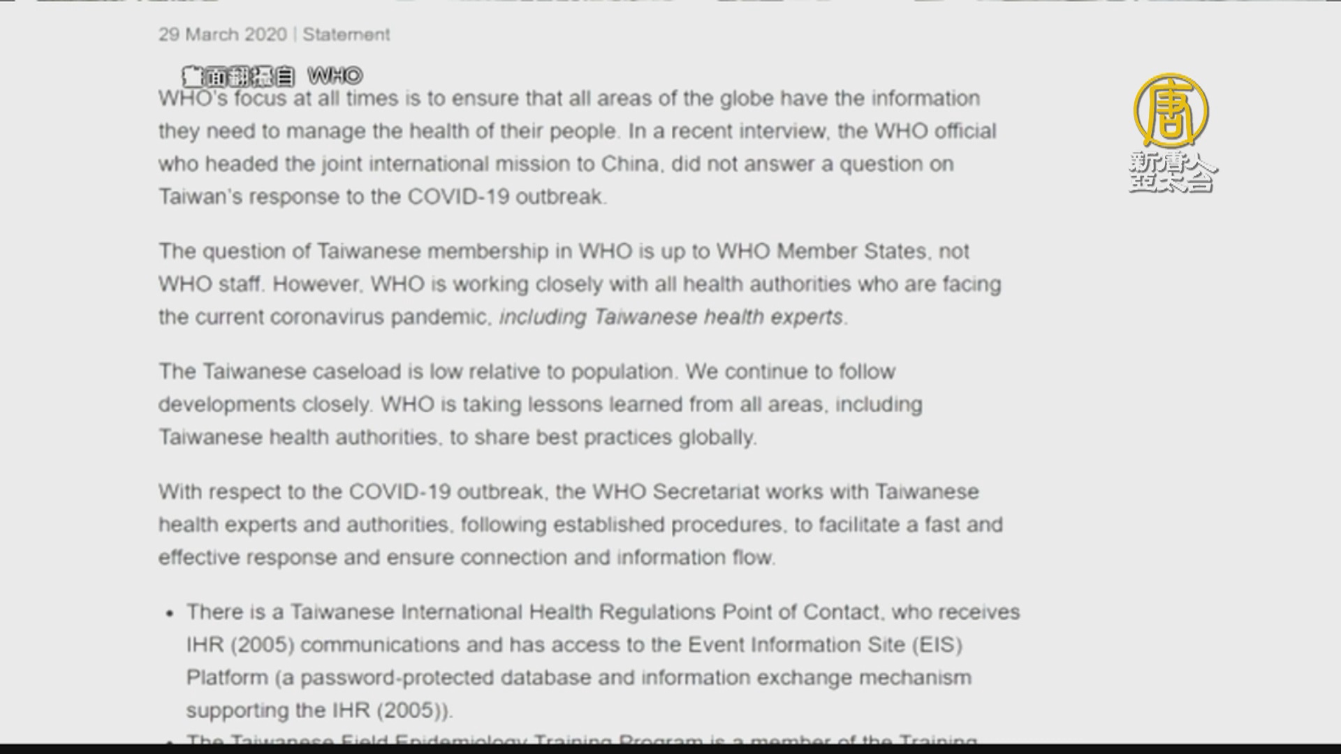 【新唐人亞太台 2020 年 03 月 30 日訊】再來看到,中共肺炎爆發以來,許多國家紛紛肯定台灣防疫成效,世界衛生組織,29日透過電子郵件發表聲明,罕見正面回應台灣參與案,聲明說,「台灣加入世衛組織的議題,取決於世衛成員國,而非世衛工作人員。儘管如此,世衛正與目前面臨疫情的所有地區密切合作,包含台灣的衛生專家。」聲明還說:「台灣目前病例占總人口比例,相對低落。我們繼續密切追蹤情勢發展。世衛持續自各地區吸取經驗,包括從台灣衛生當局;並將最佳做法分享給全球。」
