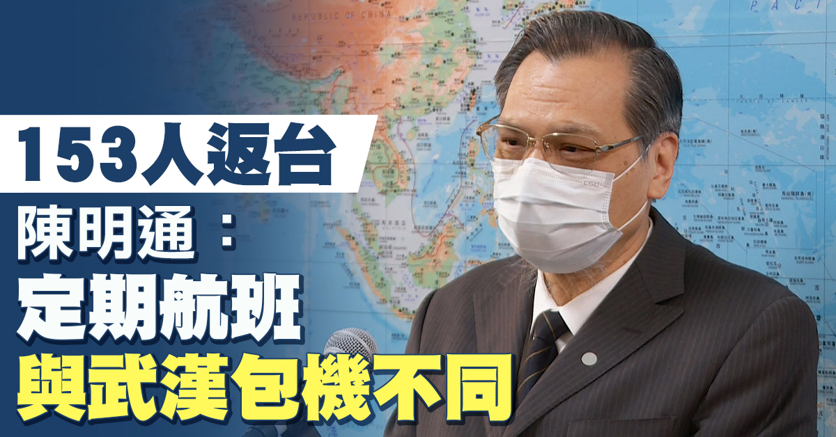 陸委會主委 陳明通:「我要強調一下好不好,我要強調一下,從上海回來這是一個定期航班,這是一個定期航班,這固定的航班,兩岸固定的航班,這個跟武漢的包機是一碼歸一碼兩件事情,所以不要說第一次第二次第三次這樣順位,去順下去,這個性質上不一樣,這武漢的包機因它4月8號解封,那這個解封後還可不可以,飛機能不能飛等等,這個還有很多變數,所以就武漢的包機我們也都在保持協商的當中,沒有進一步對外的說明,解封的這個湖北解封的縣市,你可以看到我們就是用這個指定航班、指定地點,現在指定上海,請他們坐這班飛機回來。」