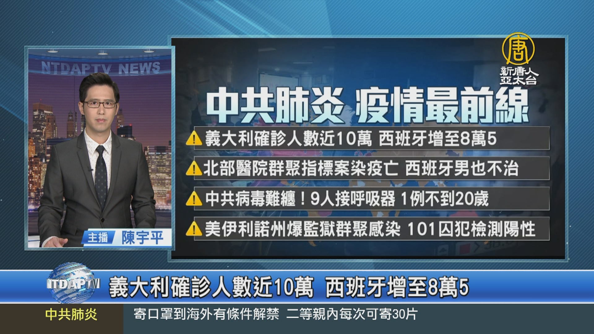 【新唐人亞太台 2020 年 03 月 30 日訊】中共肺炎禍害全球,帶您快速瀏覽今天的疫情重點:義大利確診人數達到9萬7千多人,逼近10萬大關,西班牙增至8萬5,成中國之外的染疫人數第3大國。台灣增加3例死亡!院內感染退休婦人、奧捷團領隊,以及遊西班牙染疫的6旬男子,都不幸病逝。中共病毒難纏!台灣截至昨天公布的298例確診者中,有9人接呼吸器,1例不到20歲。美國伊利諾州爆監獄群聚感染,101位囚犯檢測呈現陽性。