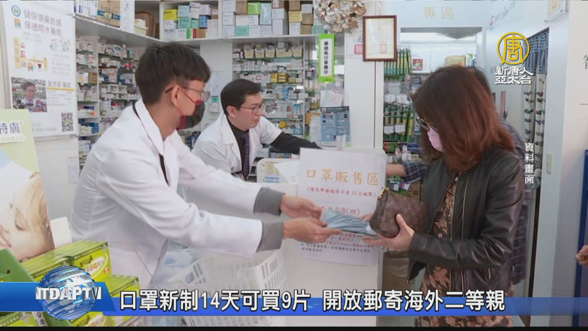【新唐人亞太台 2020 年 03 月 30 日訊】台灣口罩增加產線,生產量逐漸穩定,中央流行疫情指揮中心指揮官陳時中宣布,從4月9日起新制上路,大人改成14天可買9片、小孩14天可買10片,也解除單雙號購買限制,另外針對每個人臉型大小不同,也開放讓民眾自行選擇,購買大人或小孩的口罩。