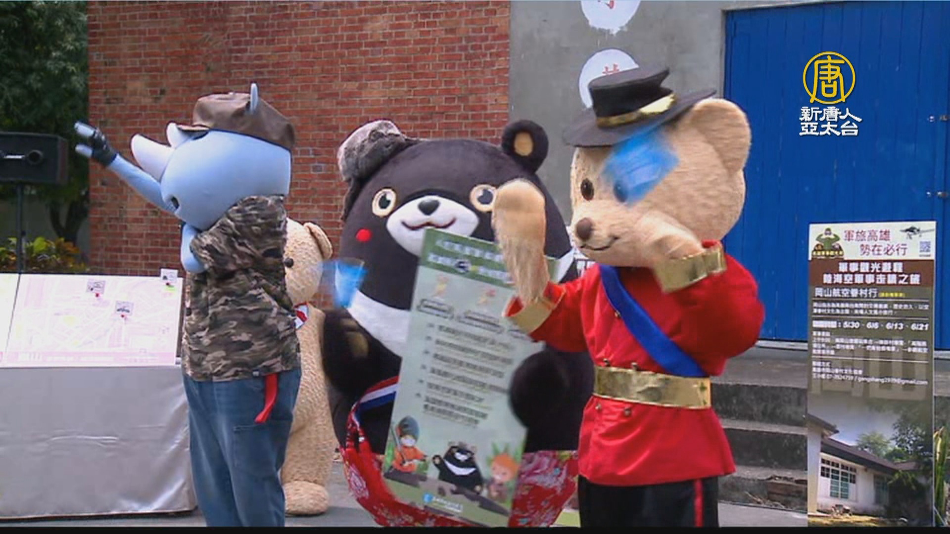 【新唐人亞太台 2020 年 03 月 30 日訊】高雄觀光局聯手文化局,4到6月依序推出專屬軍事遊程、眷村菜及住宿優惠,邀請民眾體驗獨特的軍事文化。30日記者會當天,還找來三大吉祥物,高雄熊、泰迪熊、還有職棒隊伍的吉祥物大義,首次合體,來宣傳高雄軍事觀光月。