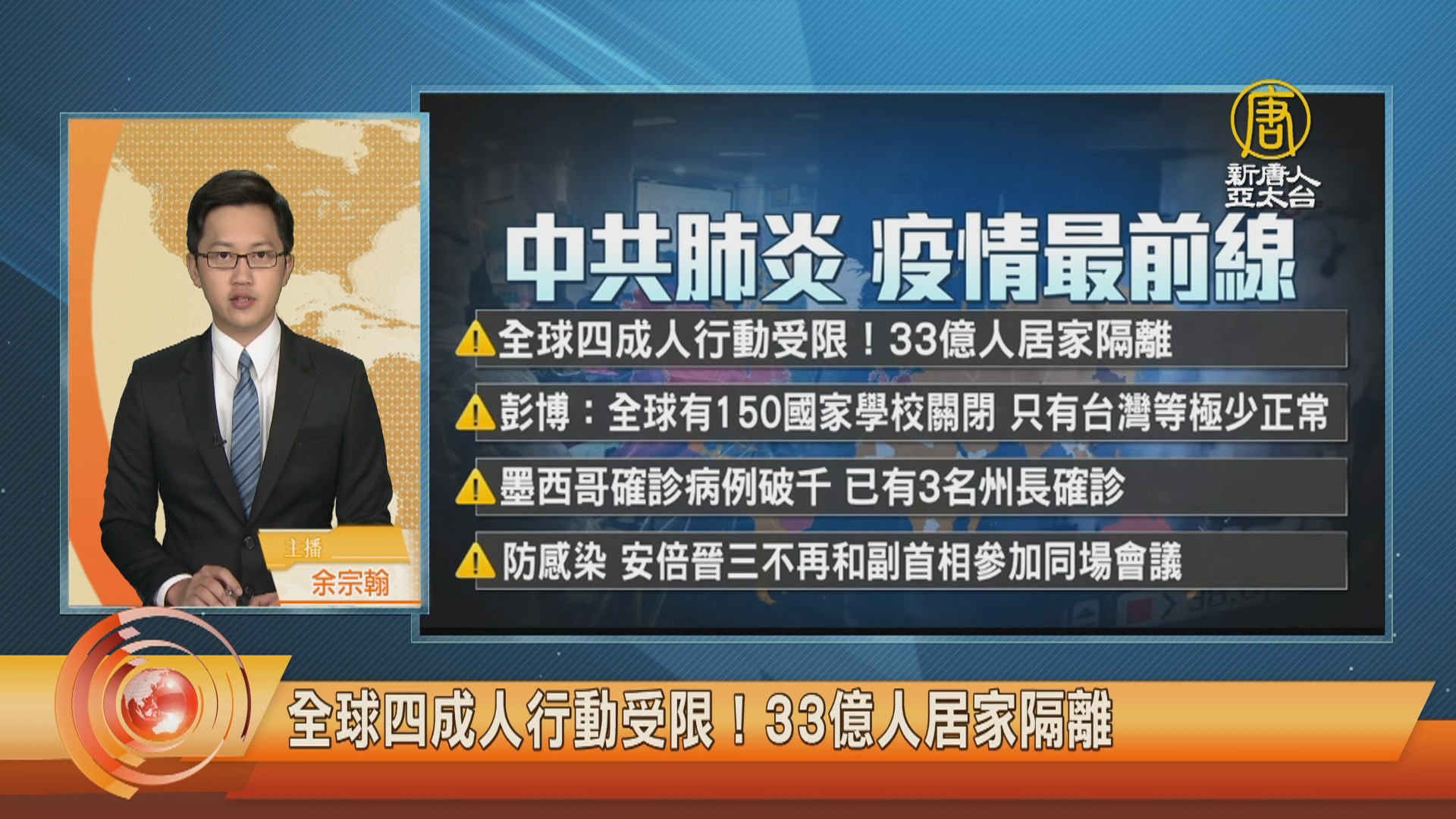 【新唐人亞太台 2020 年 03 月 31 日訊】午報頭條,先帶您來關心,中共肺炎肆虐全球超過200個國家,今天還有哪些追蹤重點,全球四成人行動受限!有33億人居家隔離。彭博報導指出:全球有150國家學校關閉。只有台灣等極少正常。墨西哥確診病例破千,已有3名州長確診。防一起被感染,日本政府宣布,安倍晉三不再和副首相參加同場會議。