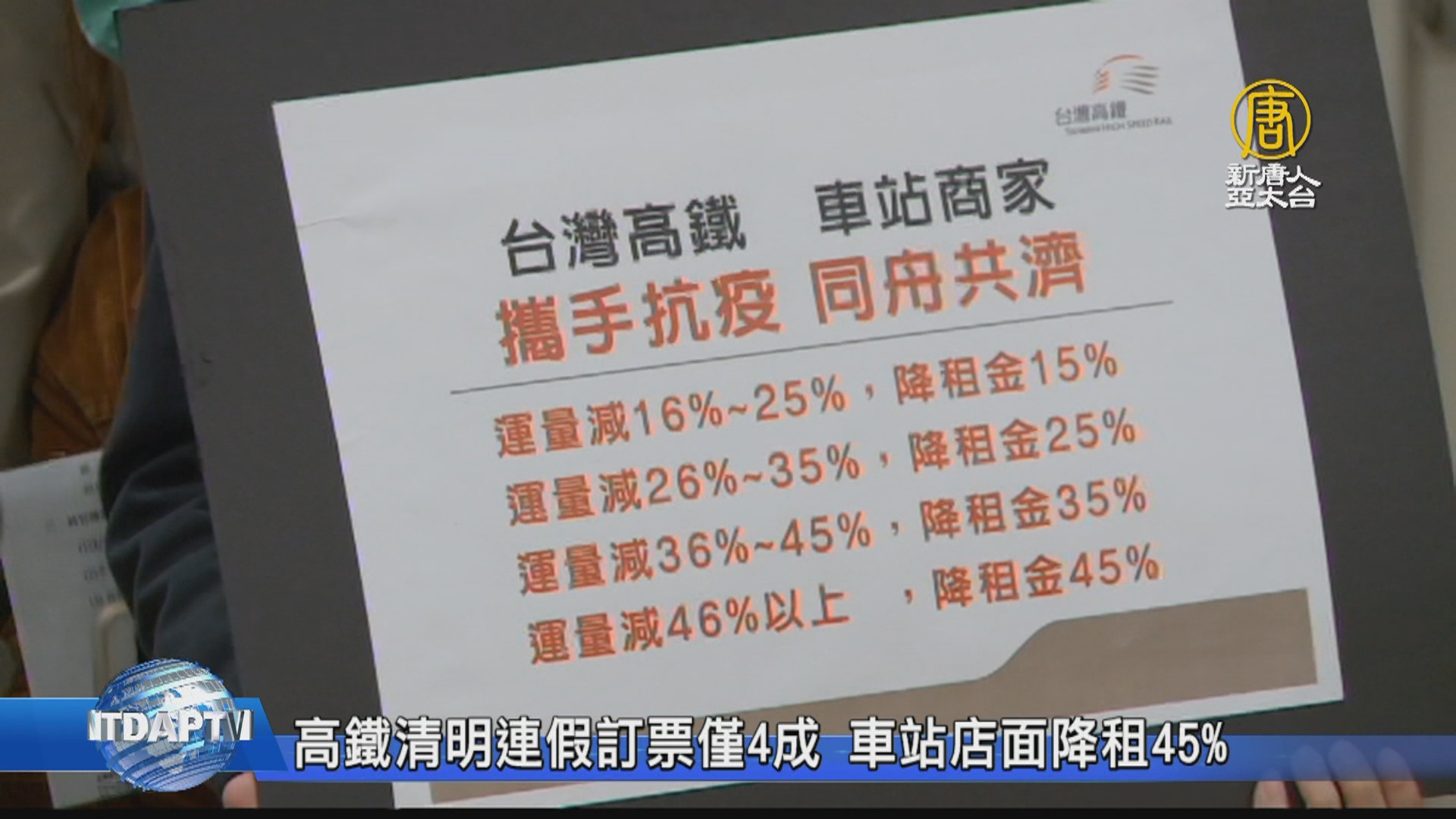 【新唐人亞太台 2020 年 03 月 31 日訊】中共肺炎疫情延燒,衝擊台灣產業,台灣高鐵今天宣佈,將主動調降各車站商場租金,與車站商場店家一同攜手對抗疫情,調降幅度最多可達45%,高鐵2月份運量與去年同期相比,下降了27%。