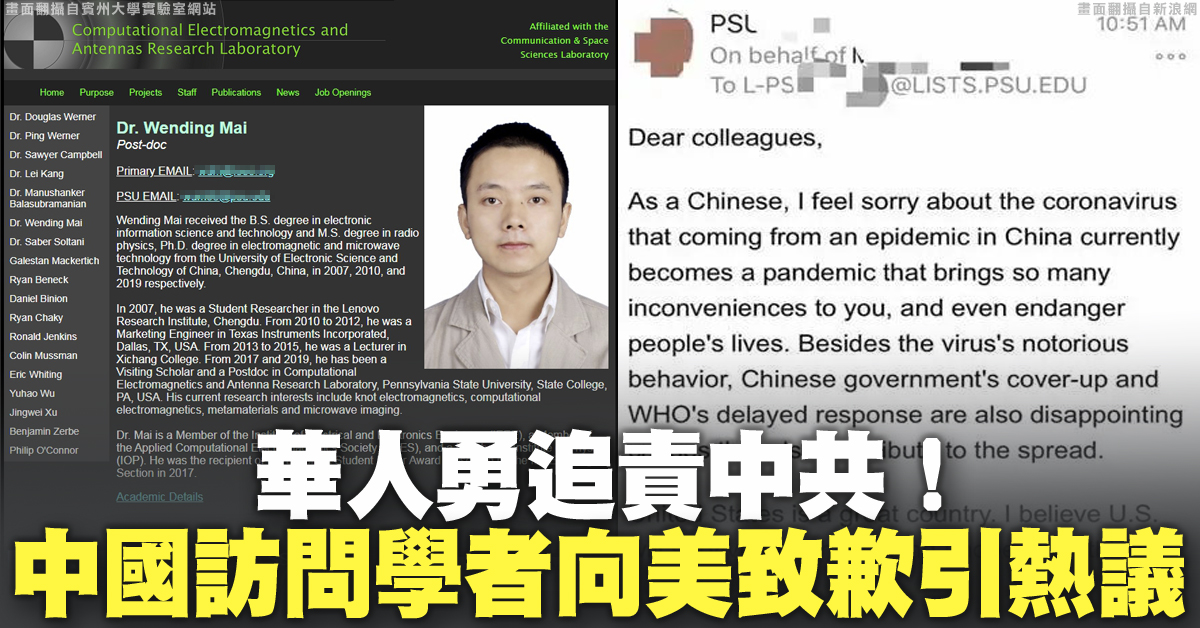 中國網路瘋傳,一位赴美訪問學者「麥文鼎」(Wending Mai,音譯),因中共病毒疫情給美國實驗室的同事們發了一封道歉郵件,引發眾多「小粉紅」崩潰跳腳。但有網民直言,五毛會崩潰,主要是因為他們沒能分清中國和中共的關係。除此之外,近日數名海外華人也接連發布影片「向美國道歉」、「向世界道歉」,並追責中共隱瞞疫情,導致病毒擴散全球。