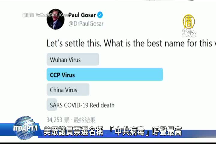 【新唐人亞太台 2020 年 04 月 01 日訊】目前,這場從中國武漢發源,擴散全球的病毒,被WHO命名為covid19,這個名字備受爭議。美國聯邦眾議員戈薩在自己的推特上發起投票,請大家票選病毒的名字,四個選項分別為「武漢病毒」、「中共病毒」、「中國病毒」、「SARS新冠肺炎紅色死亡」,目前票數,以「中共病毒」呼聲最高,52.4%的人,支持將這個肆虐全球的病毒,命名為「中共病毒」。