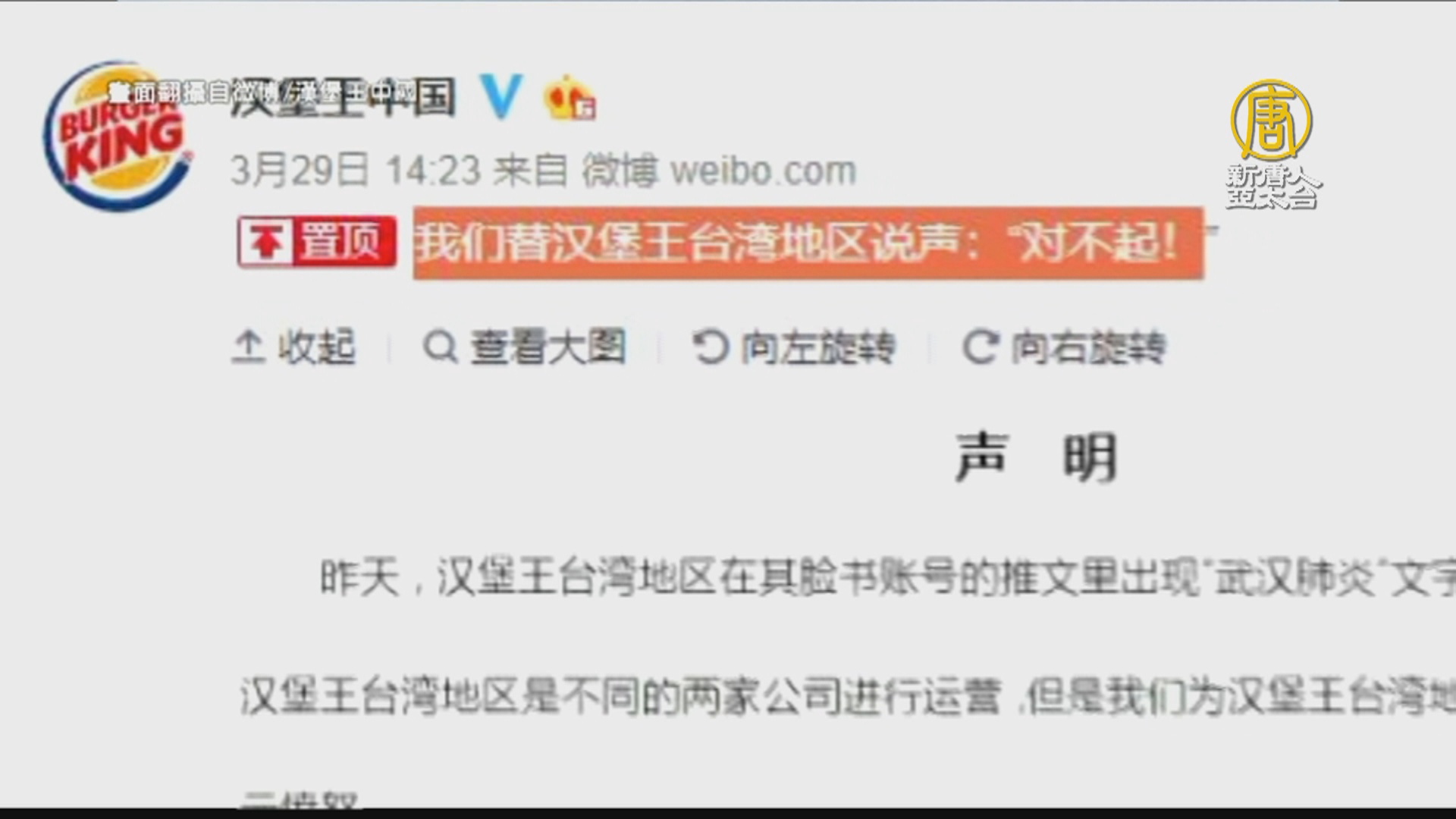 【新唐人亞太台 2020 年 04 月 01 日訊】帶您來看,台灣漢堡王在臉書發出防疫推銷文,使用「武漢肺炎」一詞,受到中共五毛攻擊。台灣漢堡王不只「被道歉」,還修改了發文內容。不過背後的大股東龔國權,之前買下中嘉有線網路,一度想賣給蔡衍明的集團;去年龔國權收購了台灣醫材大廠崇仁科技,3月將呼吸器物資輸往中國大陸武漢。國會議員提醒,要關注台灣防疫鏈,是否可能有被滲透染紅的問題。