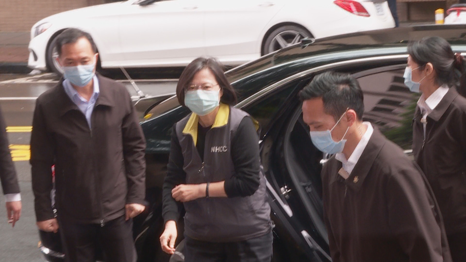中共肺炎爆發以來,中華民國總統蔡英文首次戴口罩出席公開行程,視察指揮中心,進到室內,全體工作人員,也都戴上口罩。