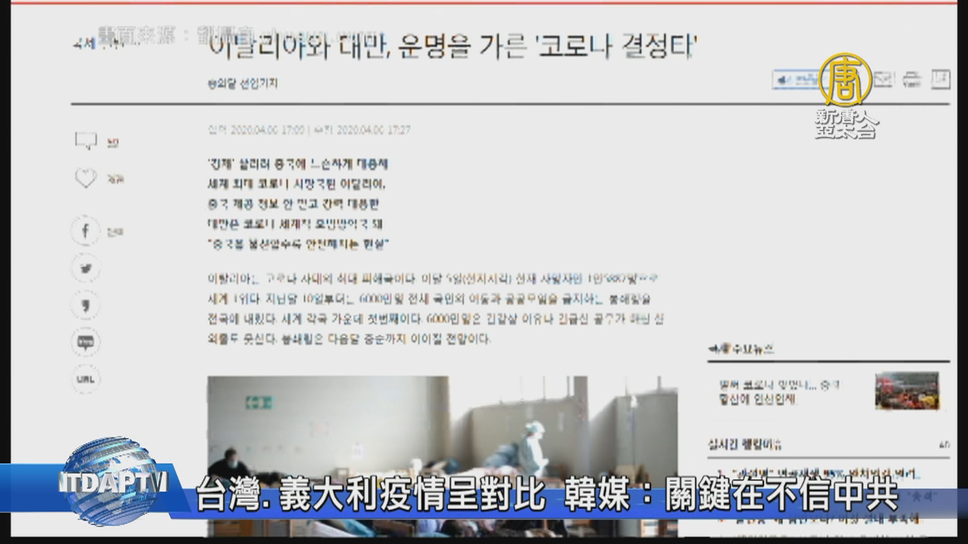 【新唐人亞太台 2020 年 04 月 07 日訊】台灣防疫成果,獲得國際高度讚賞,韓國媒體專文再度大讚台灣「不信中共」而成為防疫模範生。韓國大報《朝鮮日報》6日發表文章,以台灣義大利疫情對比,義大利疫情嚴重,但鄰近中國的台灣確診數,卻能維持在400例以下,引述專家分析,這證明了「越不信任中共就越安全」,中共執意隱匿、操作情報,終有一天,會被全球供應鏈及自由貿易秩序排除在外。