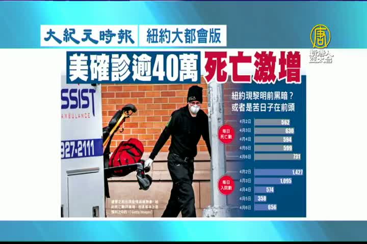 【新唐人亞太台 2020 年 04 月 09 日訊】接著看到大紀元時報紐約大都會版報導:美國確診超過40萬。死亡激增。