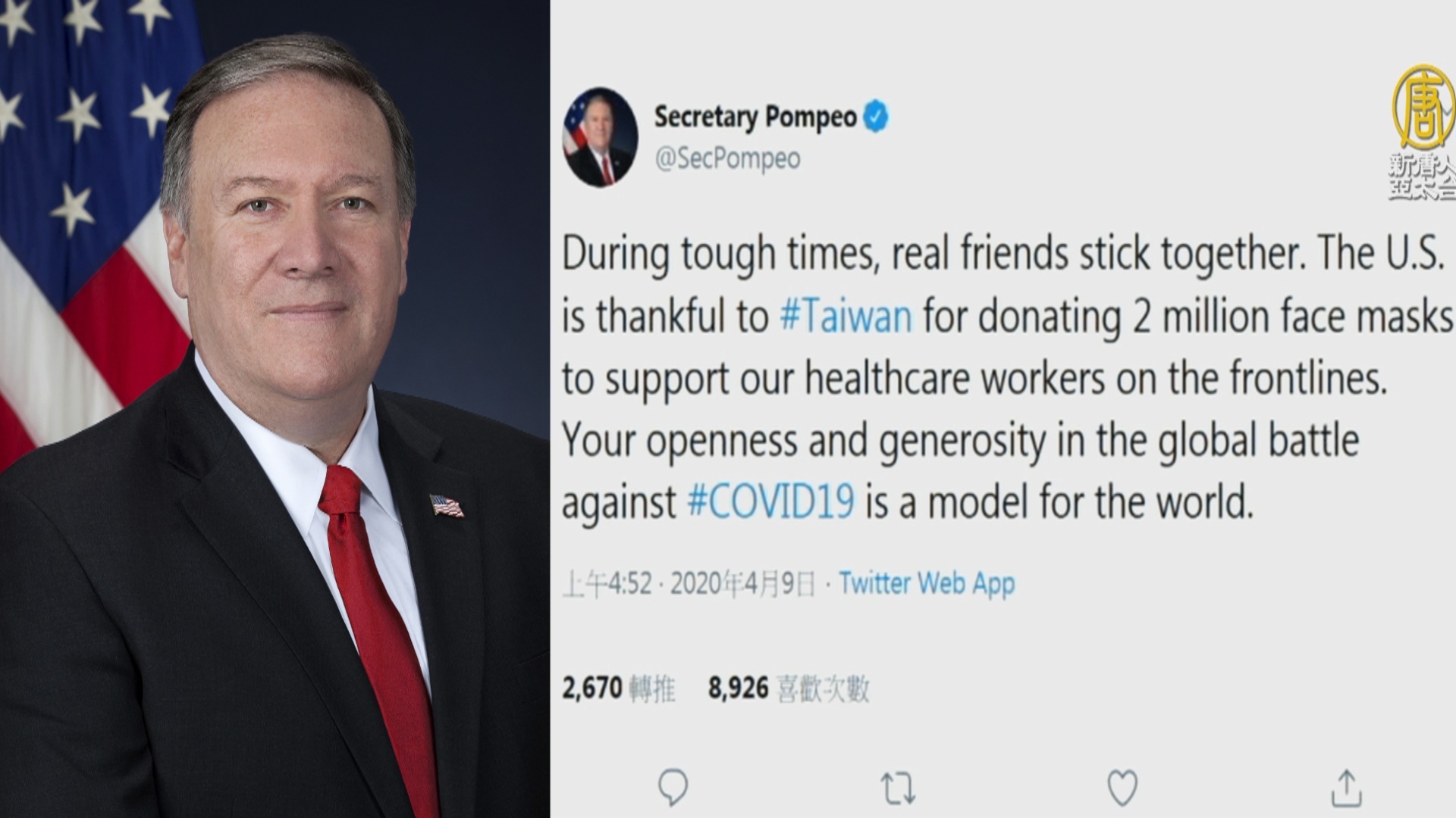 【新唐人亞太台 2020 年 04 月 09 日訊】台灣政府日前宣布三項國際援助行動,包括,捐贈1千萬片口罩,協助全球對抗中共肺炎,其中捐給美國200萬片。對此,美國國務卿蓬佩奧,今天親自推文感謝,他說,在艱難時刻,真正的朋友互相扶持,美國感謝台灣捐贈200萬片口罩,支持美國一線醫療人員。台灣所展現的透明度及慷慨,是世界的典範。
