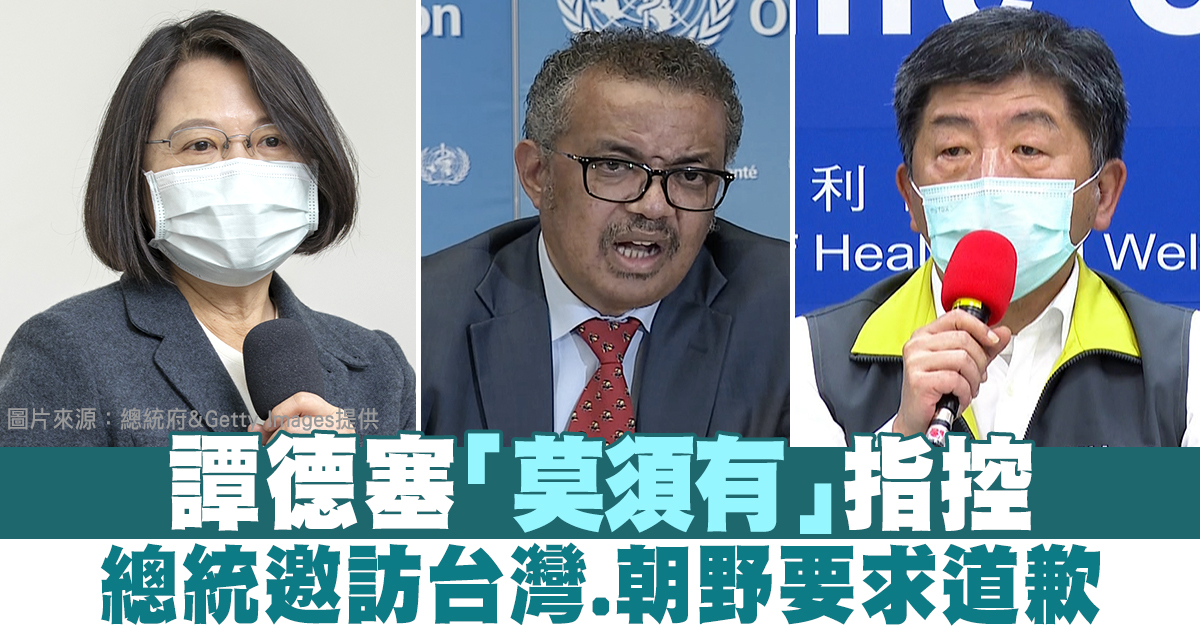 譚德塞指控台灣三個月來,對他發動種族歧視等攻擊。中華民國總統蔡英文,在臉書強烈抗議,並邀請譚德塞訪問台灣,感受台灣人民如何努力在被歧視和孤立中,堅持走向世界、貢獻國際。陳時中說,歡迎來看台灣如何支撐起防疫工作。