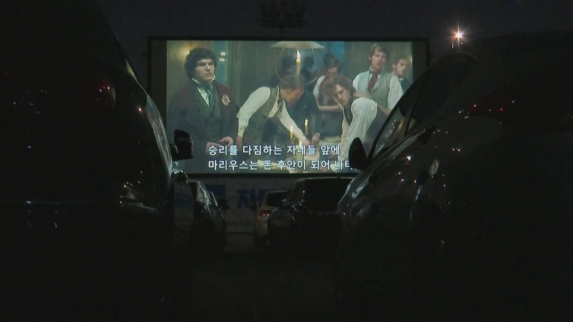 南韓首爾的一處露天大銀幕前,一排排汽車停好停滿。車裡的人沒有下車,直接在車內找到放送聲音的頻道,一邊吃著爆米花,一邊享受電影,就像置身電影院的專屬包廂。