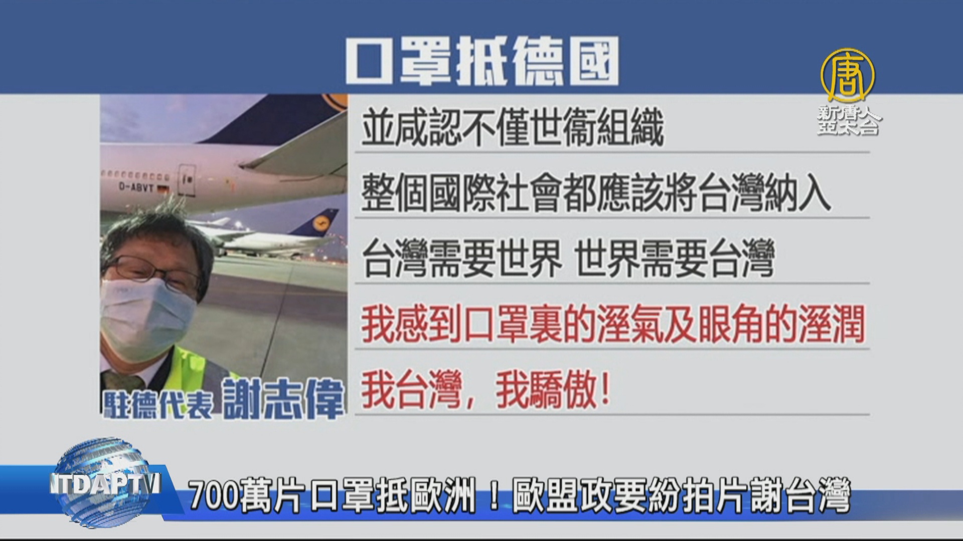 【新唐人亞太台 2020 年 04 月 11 日訊】台灣陸續捐出千萬片口罩給國際社會,有700萬片給歐洲各國的口罩昨天(10日)抵達德國,駐德代表謝志偉分享,德國議員感謝台灣,也認同不只WHO,整個國際社會都應該將台灣納入,讓他眼角濕潤,歐洲政要也紛紛拍攝影片,大力謝謝台灣是真正的朋友。