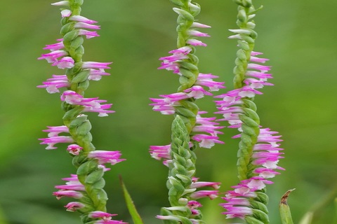 綬草花形小巧玲龍,花色豔麗的粉紅色花瓣,旋轉攀附在翠綠的花軸上,又稱為盤龍草。(黃淑恩提供)