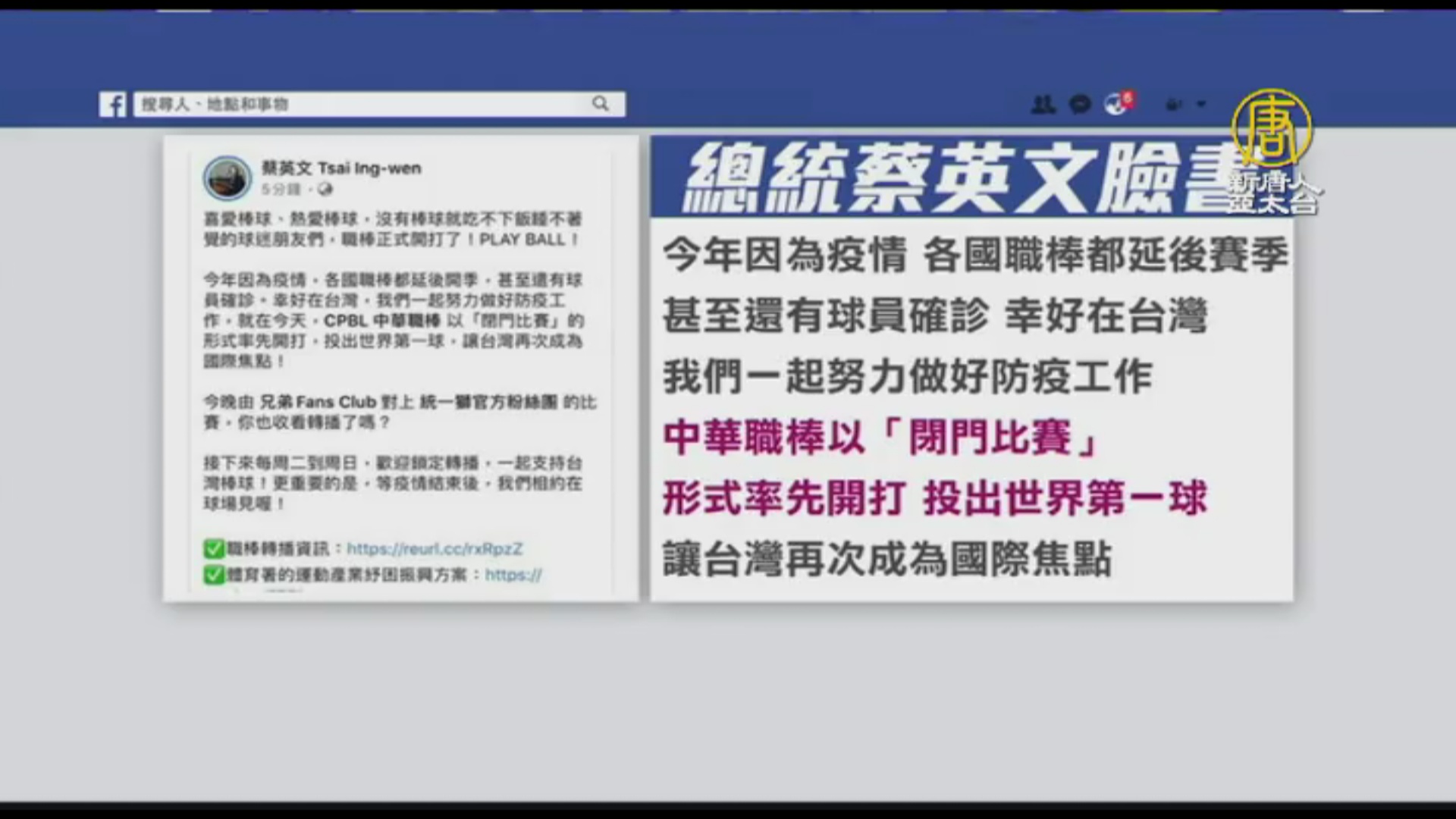 【新唐人亞太台 2020 年 04 月 13 日訊】歡迎收看今天的好樣Formosa。受到疫情影響,各國運動賽事紛喊卡,中華職棒成為2020年唯一開打的職棒,不少外媒專文報導,鄰近台灣的日本,媒體以「台灣職業棒球開幕、世界最速」等標題大篇幅報導。總統蔡英文也分享自己坐在電視機前,收看中華職棒開打的照片。