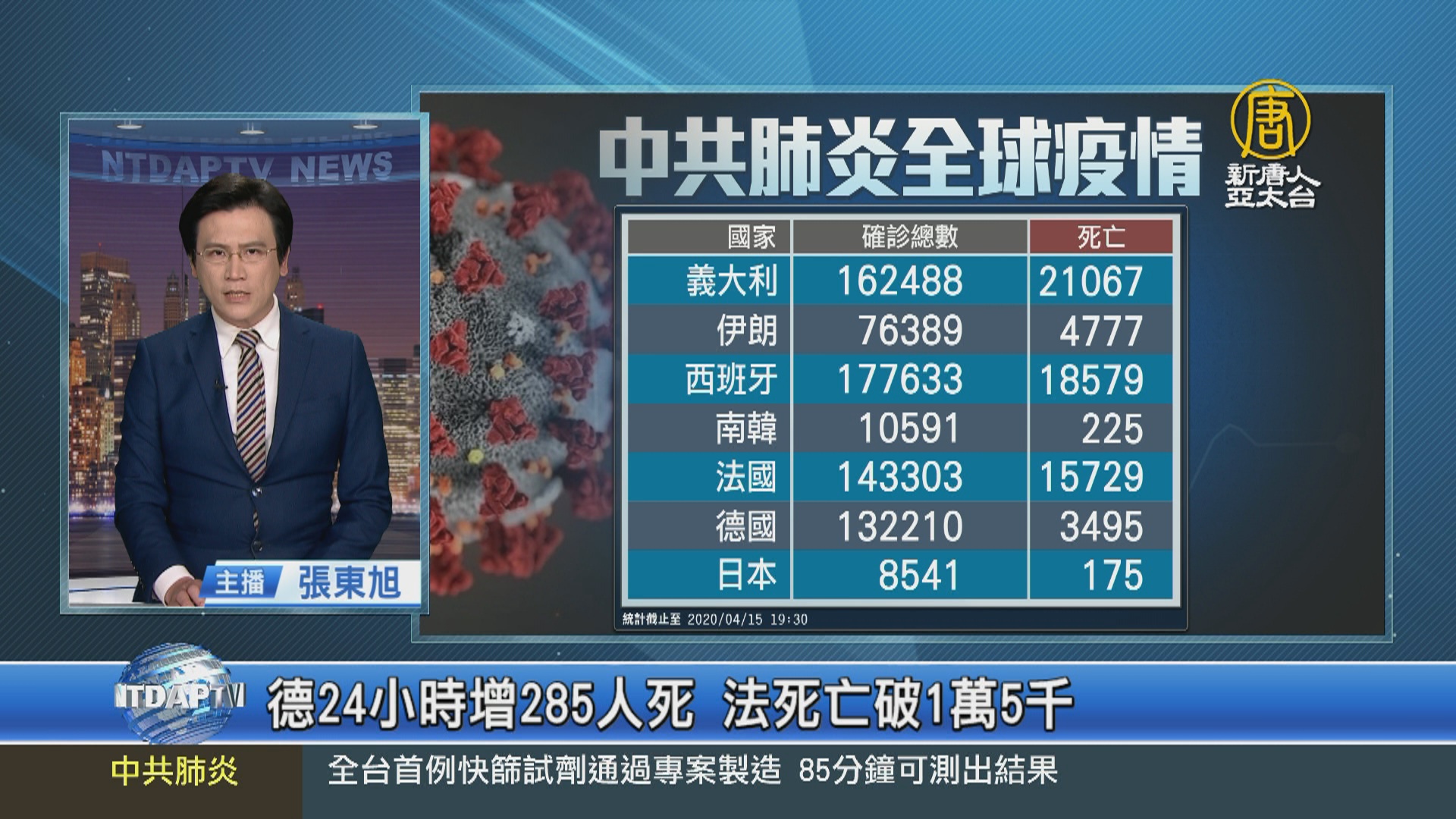 【新唐人亞太台 2020 年 04 月 15 日訊】再來看到,中共肺炎在部分國家的災況:義大利新增確診2千972例、602死,累計確診達16萬2千488例、死亡2萬1千067人,單日新增確診病例數再創新低。