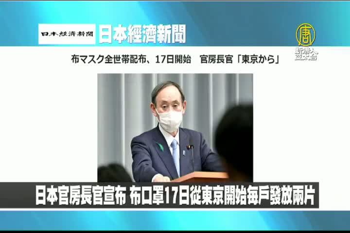 【新唐人亞太台 2020 年 04 月 16 日訊】來看到日本經濟新聞報導:日本官房長官宣布,布口罩17日從東京開始每戶發放兩片。