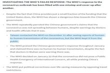 白宮15日的新聞稿也指出,世衛在1月整個月不斷讚揚中國對疫情的因應措施,卻不顧武漢醫師與衛生官員警示病毒可能人傳人,而台灣當局看到病毒有人傳人的相關報導後,在去年12月31日向世衛告知,但世衛卻未將這項訊息公諸於世。