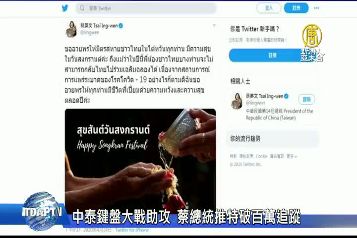 【新唐人亞太台 2020 年 04 月 16 日訊】台灣防疫告捷,讓總統蔡英文連日(15日)登上國際媒體。為了讓台灣的聲音走入國際,蔡總統積極進行社群外交,日前還首度在推特以泰文推文,祝泰國朋友潑水節快樂,加上最近網路中泰大戰的助攻下,總統推特已經破百萬人追蹤。