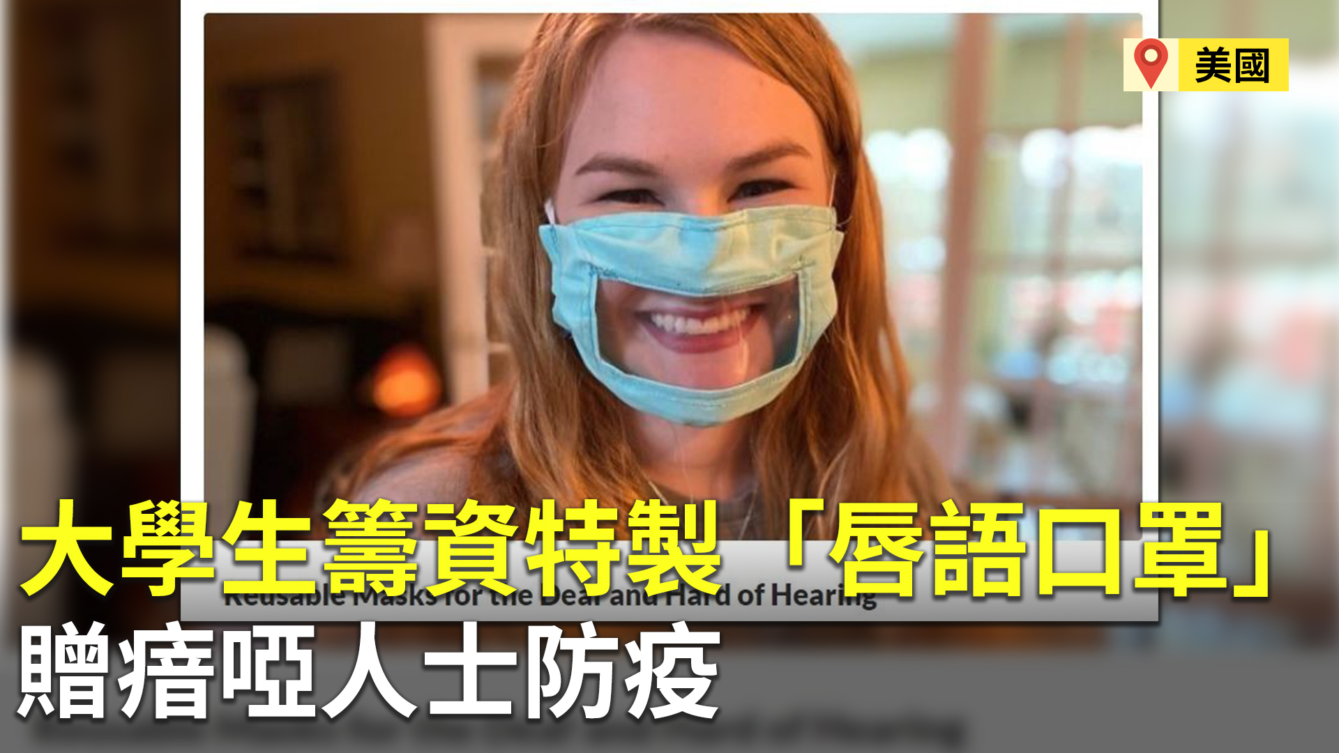【新唐人亞太台 2020 年 04 月 17 日訊】中共肺炎疫情擴大,世界各地都引發搶購口罩潮,在美國,一位女大學生發現在疫情嚴重,許多人都在等待接受檢查,溝通顯得相當重要,聽障人士如果看不到唇形,更容易引起恐慌,因此她希望能製作專門讓聾啞人士方便辨識的口罩,並且以免費發放的方式,贈送給有需要的人。