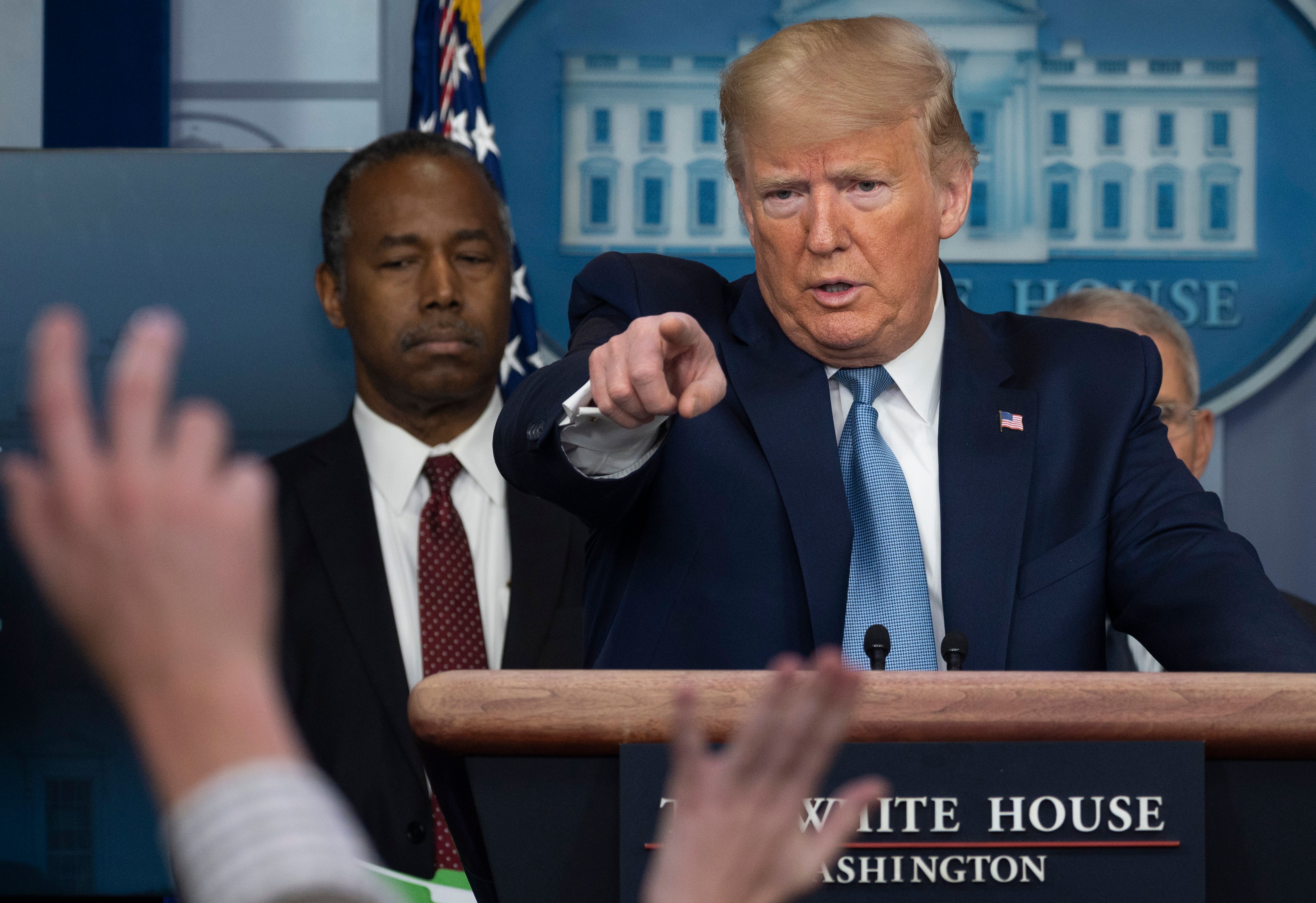 美國總統川普,在白宮主持疫情簡報會議,資料照片。(Photo by JIM WATSON/AFP via Getty Images)