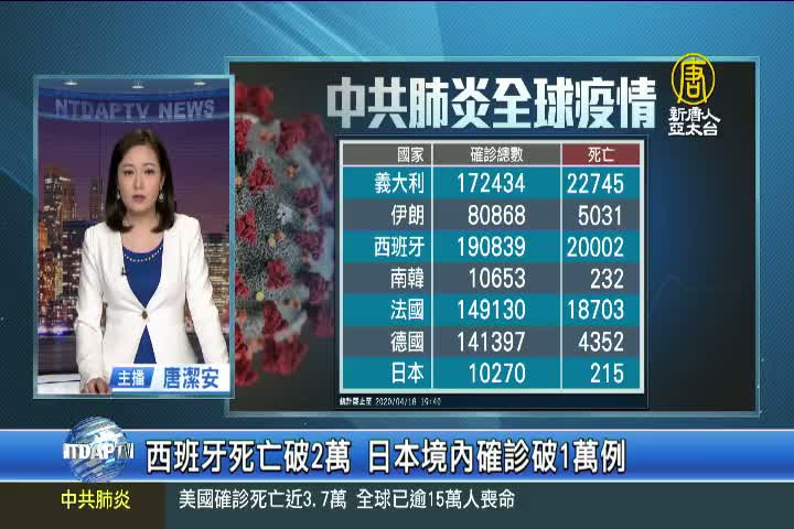【新唐人亞太台 2020 年 04 月 18 日訊】再來看到,中共肺炎在部分國家的災況:義大利累計確診達17萬2千434例,其中2萬2千745人死亡。西班牙確診達19萬839例、死亡突破2萬人。法國確診達14萬9千130例、死亡1萬8千703人,德國確診達14萬1千397例、死亡4千352人。南韓確診新增18例,累計1萬653例,是近2個月來單日新增病例最少的一天,共232人死亡。而日本東京今天新增181起確診,日本境內本土累積確診突破1萬例,達1萬270例,215死。
