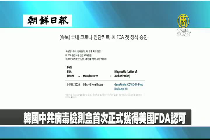 【新唐人亞太台 2020 年 04 月 20 日訊】來看到韓國朝鮮日報報導:韓國中共病毒檢測盒首次正式獲得美國FDA認可。