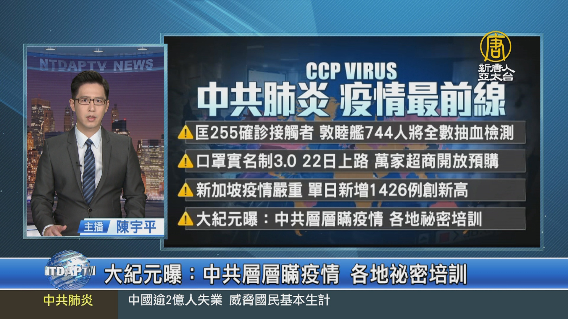 【新唐人亞太台 2020 年 04 月 20 日訊】新聞首先來關心,今天有哪些疫情追蹤重點,全球有241萬人確診感染中共肺炎,超過16萬人死亡。台灣今天新增兩例確診。指揮中心追磐石艦24人確診!匡列255名接觸者,推估已不只一波感染,將對3艘船員744人,全數抽血檢測。蘇貞昌拍板!口罩實名制3.0周三(22日)上路,民眾屆時可持健保卡,到4大超商的1萬多家門市預購口罩。新加坡單日新增1426個確診病例創新高,絕大部份來自外籍勞工宿舍。大紀元獲得中共內部文件顯示,中共從上到下層層對外隱瞞疫情,但其內部早在1月15日就開始分層級地進行祕密培訓,部署防控方案。