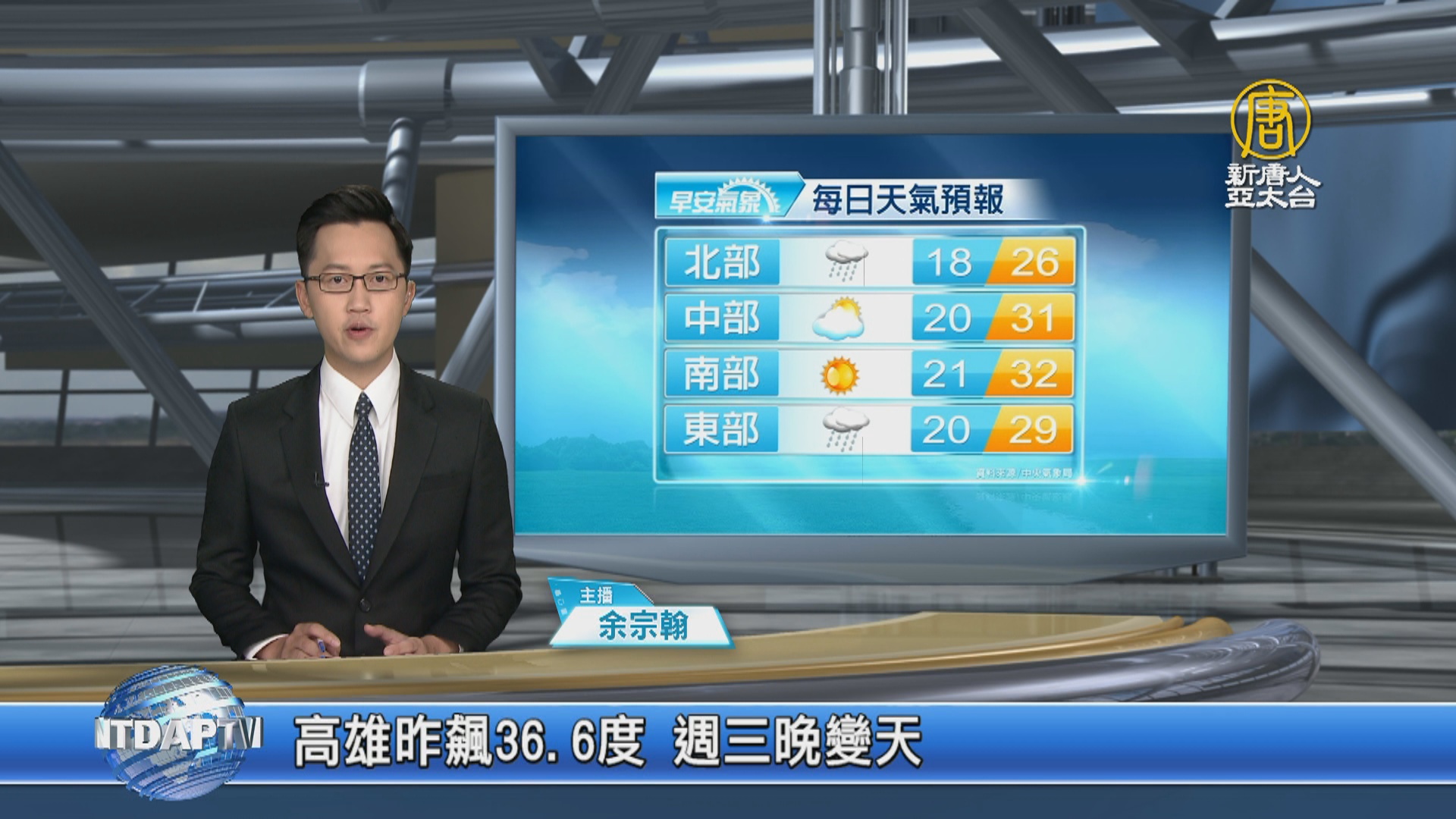 【新唐人亞太台 2020 年 04 月 21 日訊】歡迎您收看4月21日的早安新唐人,我是余宗翰,先來帶您關心今天的天氣情況。昨天全台最高溫,發生在高雄市甲仙測站達36.6度,今天(20日)微弱鋒面掠過,北部有零星短暫雨,中午之後放晴,全台白天高溫介於26度到33度之間。明晚(21日)變天,隨著鋒面接近,本週將會有愈來愈濕涼的趨勢。帶您一起來看到國際媒體重要訊息。