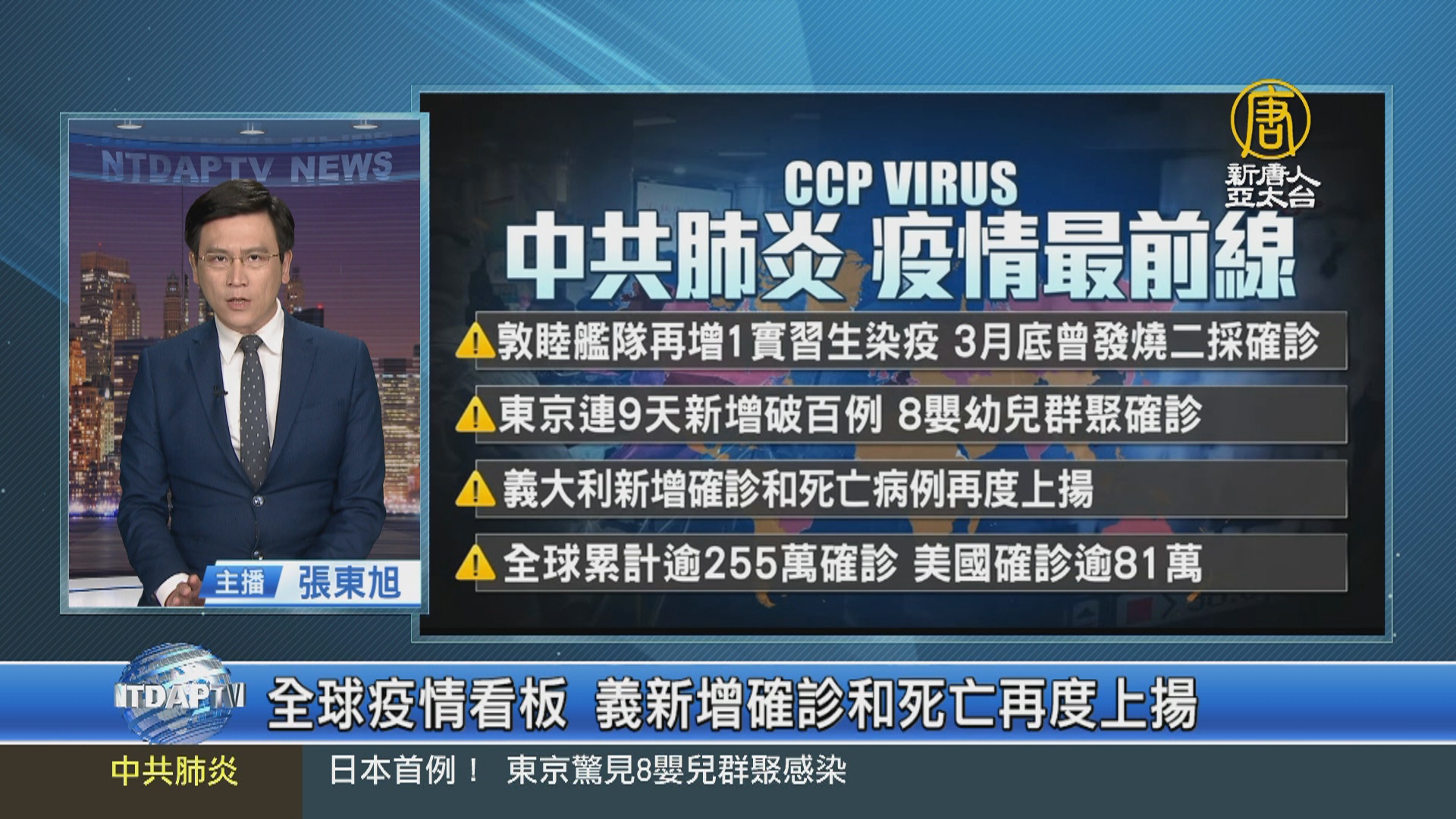 【新唐人亞太台 2020 年 04 月 22 日訊】新聞首先馬上帶您來瀏覽,今天的重要疫情發展。台灣敦睦艦隊再有1實習生在第二次採驗時確診,3月底曾發燒。日本東京連9天新增確診破百例,8名嬰幼兒群聚確診。義大利新增確診和死亡病例,今天再度上揚。全球累計已經超過255萬確診,中共、伊朗數據被質疑嚴重低估,美國確診已達到81萬。