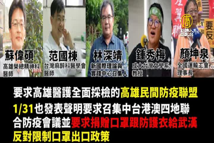 【新唐人亞太台 2020 年 04 月 24 日訊】防堵疫情,高雄市長韓國瑜下個月要進行兵推,還拋出高雄4000醫護要普篩,這些動作呼應「高雄民間防疫聯盟」週三記者會拋出的主張,但聯盟成員有6位,曾參與發起捐口罩給中國的聲明外,背景除了有精神科醫師,甚至連文學系教授都有,遭到立委質疑不專業,韓國瑜想藉著防疫作秀,來因應高雄罷韓行動。