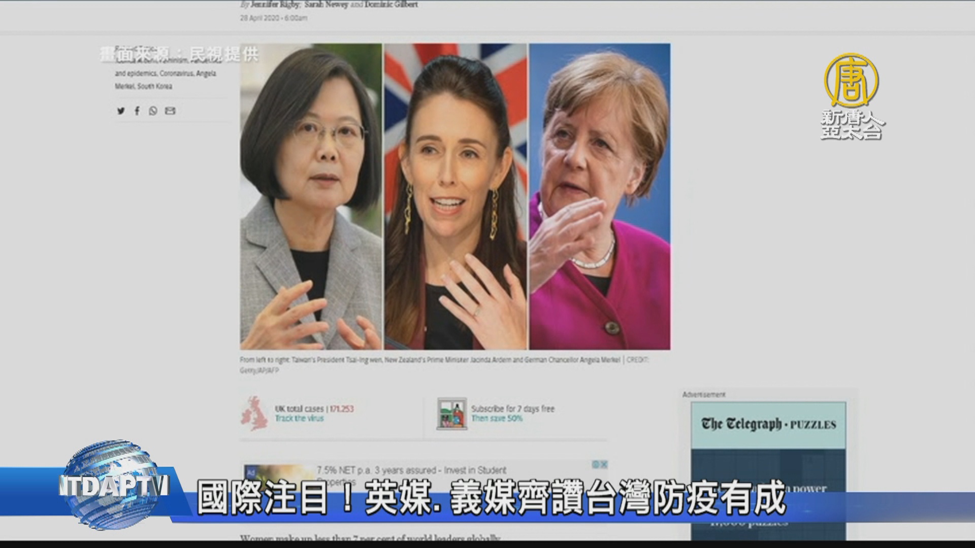 台灣防疫表現再獲外媒肯定,英媒每日電訊報就將蔡總統的照片,與紐西蘭總理阿爾登和德國總理梅克爾擺在一起,刊出一篇「為何女性領導人在應對病毒疫情時如此在行?」的文章。