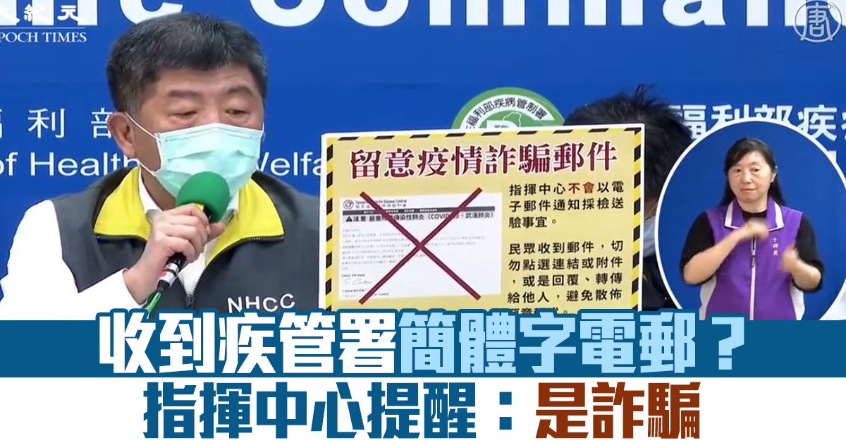 【新唐人亞太台 2020 年 05 月 04 日訊】中央流行疫情指揮中心今(4)日表示,近期接獲民眾陸續反映,收到以疾病管制署(notices@cdc.gov.tw)名義發送,主旨為「台湾疾病預防控制中心的最终通知」的電子郵件。指揮官陳時中表示,這是一個詐騙的釣魚信,千萬不要點選,如果有疑問可以致電1922詢問。