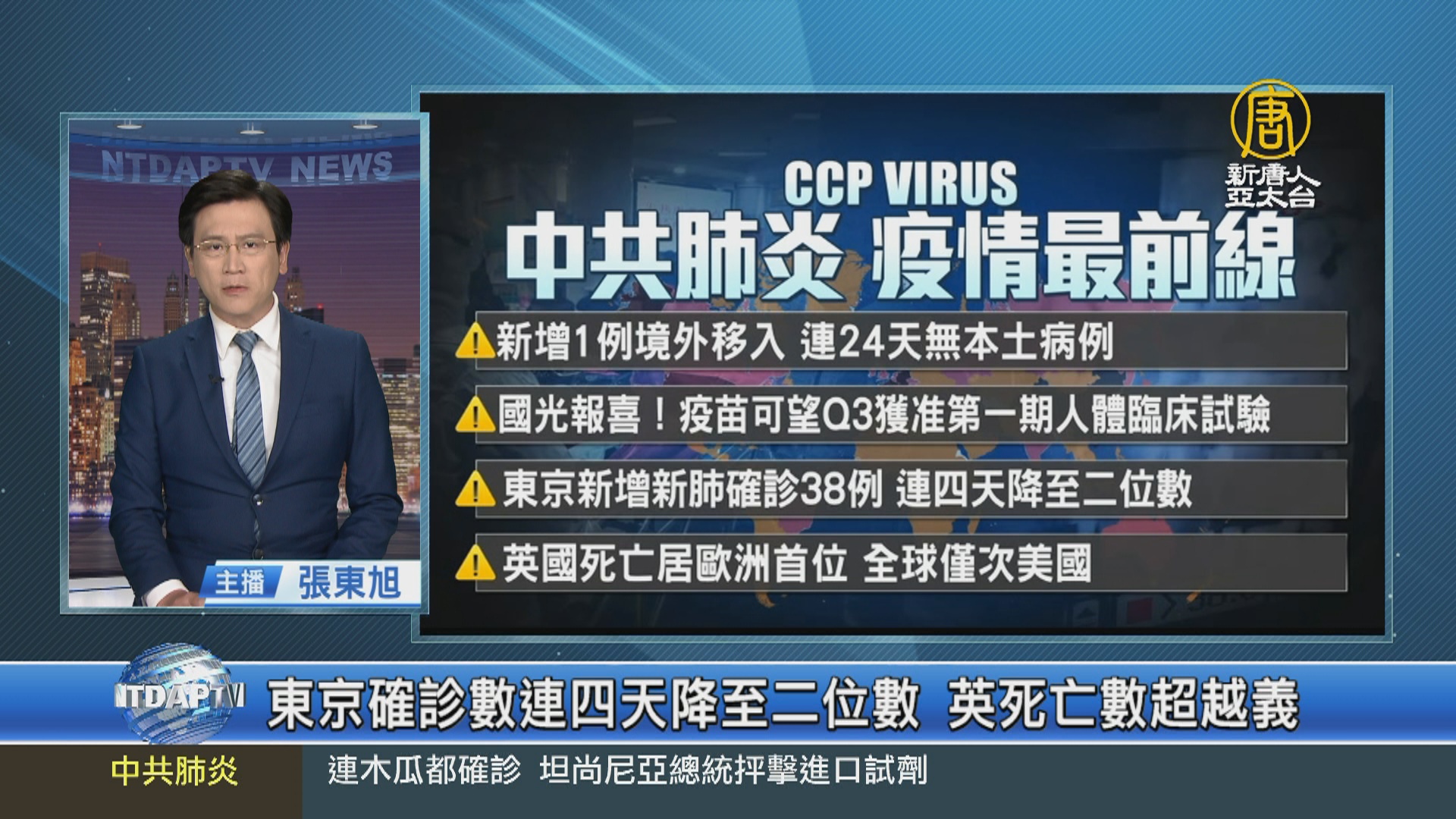 【新唐人亞太台 2020 年 05 月 06 日訊】新聞首先來看到,今日疫情發展重點。台灣新增1例境外移入,已經連24天無本土病例。台灣國光疫苗報喜!可望在第三季,獲准第一期人體臨床試驗。日本東京新增確診38例,已經連四天降至二位數。英國因為中共肺炎死亡總人數居歐洲首位,超過義大利。