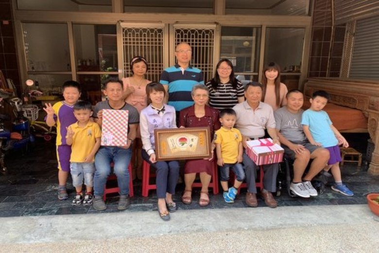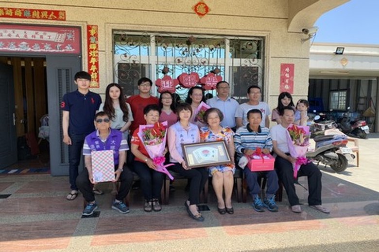 高齡母親獲獎,大家在眾多兒孫的簇擁下歡喜受獎(朴子市公所提供)