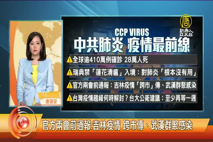 【新唐人亞太台 2020 年 05 月 11 日訊】午報頭條,先來關心中共肺炎的追蹤動態,全球超過410萬例確診,28萬人死亡。瑞典禁止中共的「蓮花清瘟」中藥進口:表示對肺炎治療「根本沒有用」。中共官方在兩會前通報:吉林疫情「跨市」傳播、武漢5人群聚感染。台灣疫情趨緩何時解封?台大公衛建議:至少再等一週。