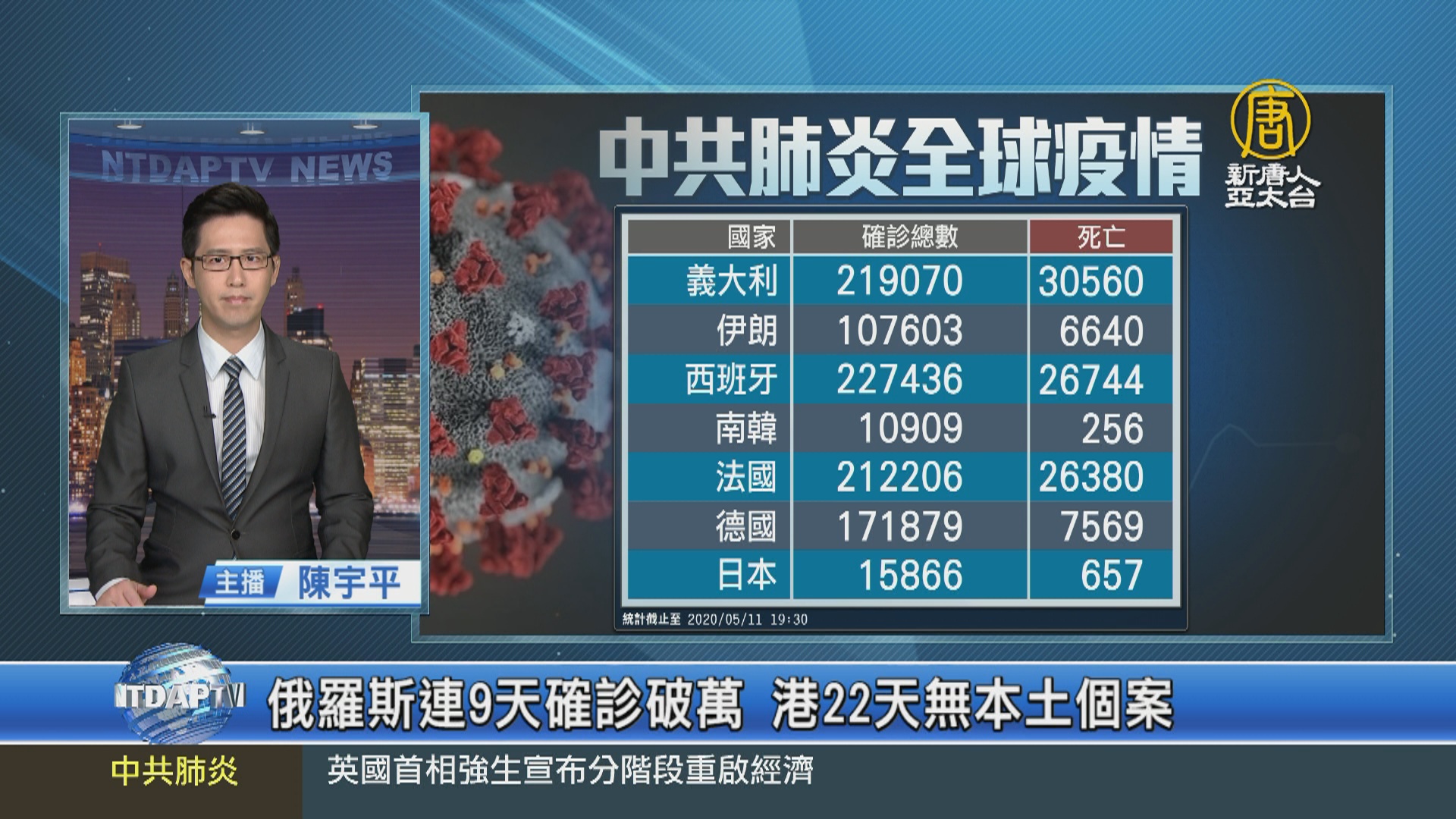 【新唐人亞太台 2020 年 05 月 11 日訊】繼續來看到,中共肺炎在部分國家的災況,俄羅斯確診連續9天破萬,累計22萬1千344例、死亡2千09人,病例躋下英國和義大利,成為全球第3大疫國,僅次於美國和西班牙。不過中共、伊朗、北韓等國家被認為嚴重低報數據。義大利累計確診達21萬9千070例、死亡3萬5百60人。南韓累計確診1萬9百09例,其中,首爾夜店確診總計86例,死亡2百56人,連續4天沒有新增死亡病例。日本東京新增15例確診,連續第9天跌到百例以下、連續6天低於50例,東京累計確診達4千8百83例。香港今天再度零確診,連續22天沒有本土病例。而新加坡新增486起確診,累計2萬3千8百22例、死亡20人。
