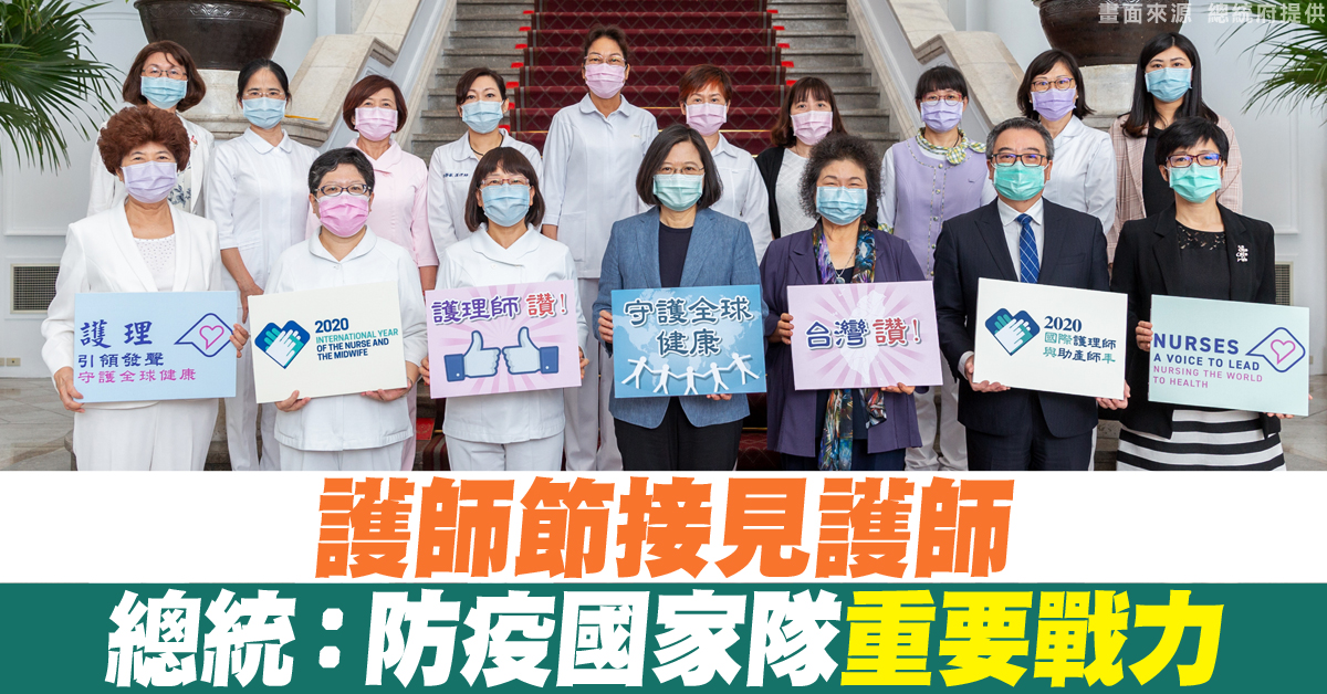 【新唐人亞太台 2020 年 05 月 12 日訊】帶您來看到,今天(12日)是國際護理師節,總統蔡英文,上午接見了護理界代表,特別感謝全國護理人員在防疫期間的勇敢專業和貢獻,表示護理人員是防疫國家隊重要戰力,也希望未來護理界能和政府繼續一起努力。