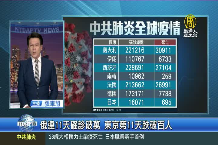 【新唐人亞太台 2020 年 05 月 13 日訊】來看到,中共病毒肺炎疫情(武漢肺炎)在部分國家的災況,俄羅斯連續第11天單日確診增加超過一萬例,累計24萬2千2百多例、死亡超過2千2百人。義大利累計確診22萬1千2百多例、死亡3萬9百多人。南韓新增26例確診,累計1萬9百62例、死亡259人,其中首爾夜店的確診病例總計119例。日本東京新增10人確診,連續第11天跌破百人以下,不過到5月13日,日本已有142家公司因中共肺炎疫情破產。香港新增3例確診,累計達1千050例。新加坡目前是東南亞疫情最嚴重國家,新增675例確診,累計達2萬5千3百多例,死亡21人。全球疫情中,中共、伊朗、北韓等國家被認為嚴重低報數據。