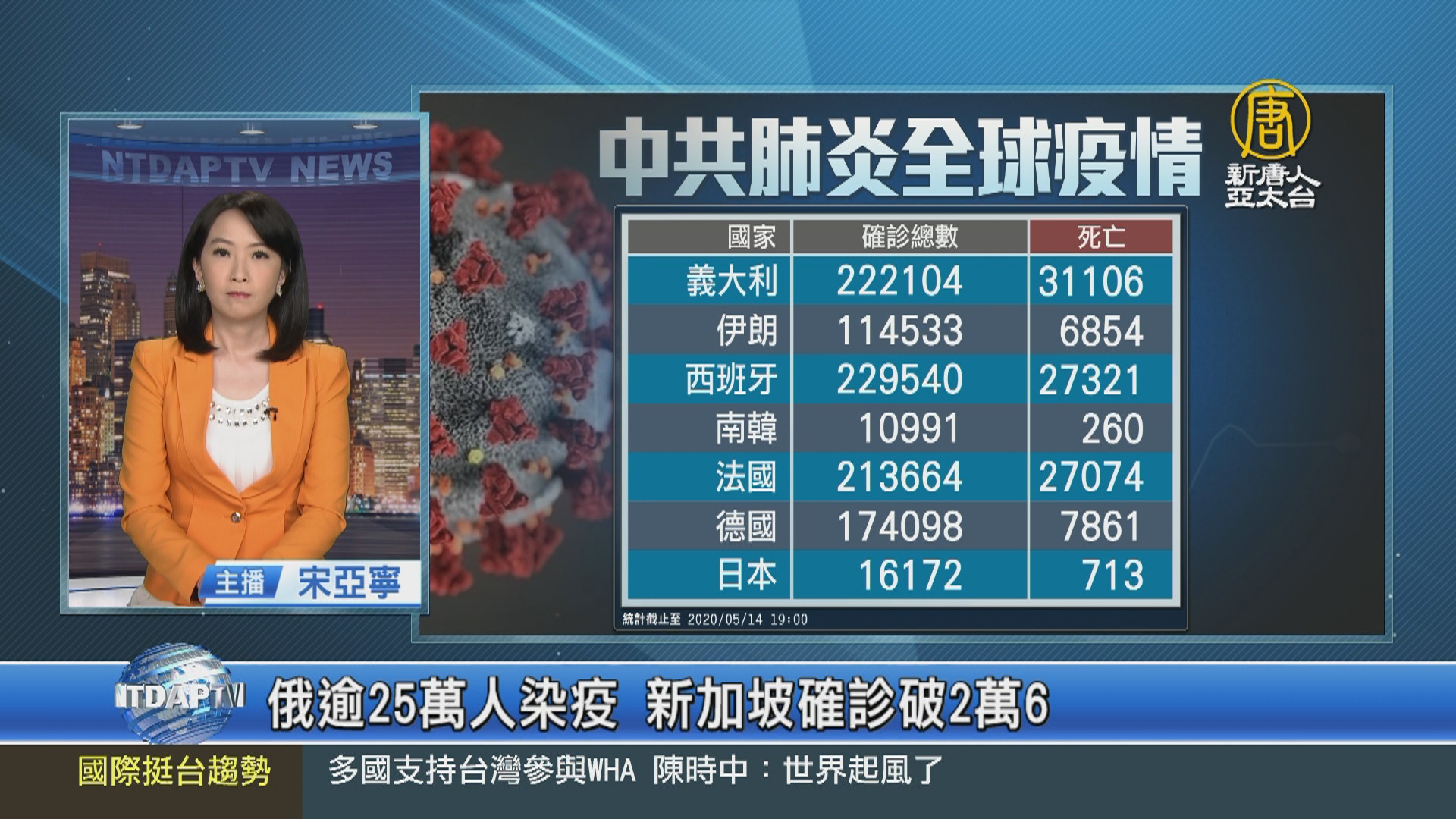【新唐人亞太台 2020 年 05 月 14 日訊】歡迎回來,帶您看到,中共肺炎在部分國家的災況,俄羅斯新增9千9百多例確診,終結連續11天的單日破萬的紀錄,累計達25萬2千2百多例,死亡超過2千3百人。義大利累計確診達22萬2千1百多人、超過3萬1千1百人死亡。南韓確診達1萬9百多例,共2百60人死亡,首爾夜店確診病例增加到133例。日本東京確診連續12天降到1百以下,首相安倍晉三宣布,對39個縣解除緊急事態宣言,但不含東京、大阪、北海道等8行政區。新加坡再增752例確診,境內確診數突破2萬6千例、21死,確診數居東南亞之冠。不過中共、伊朗、北韓等國家被認為嚴重低報數據。
