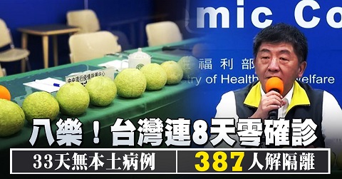 台灣連8天零確診 33天無本土病例 387人解隔離