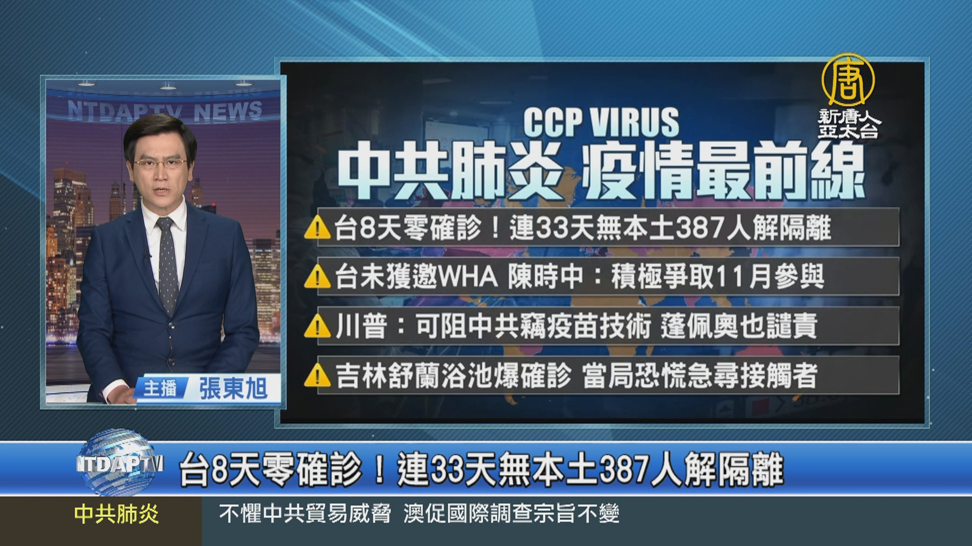 【新唐人亞太台 2020 年 05 月 15 日訊】新聞先來看到,今天的疫情重點。台灣疫情穩定趨緩,連8天零確診,連33天無新增本土感染病例,累計387人解除隔離。世界衛生大會視訊會議倒數3天,台灣受邀機率不高,陳時中指出,若11月會補辦實體會議,我方一定會積極爭取。中共駭客持續發動攻擊,企圖竊取美國研究中共病毒疫苗,美國國務卿發表聲明譴責。川普則說「可以阻止它們」;中國吉林省舒蘭市封城後,昨天(14日)再爆出浴池員工確診,當局恐慌急發緊急通知,要求相關人員要實施21日居家隔離。