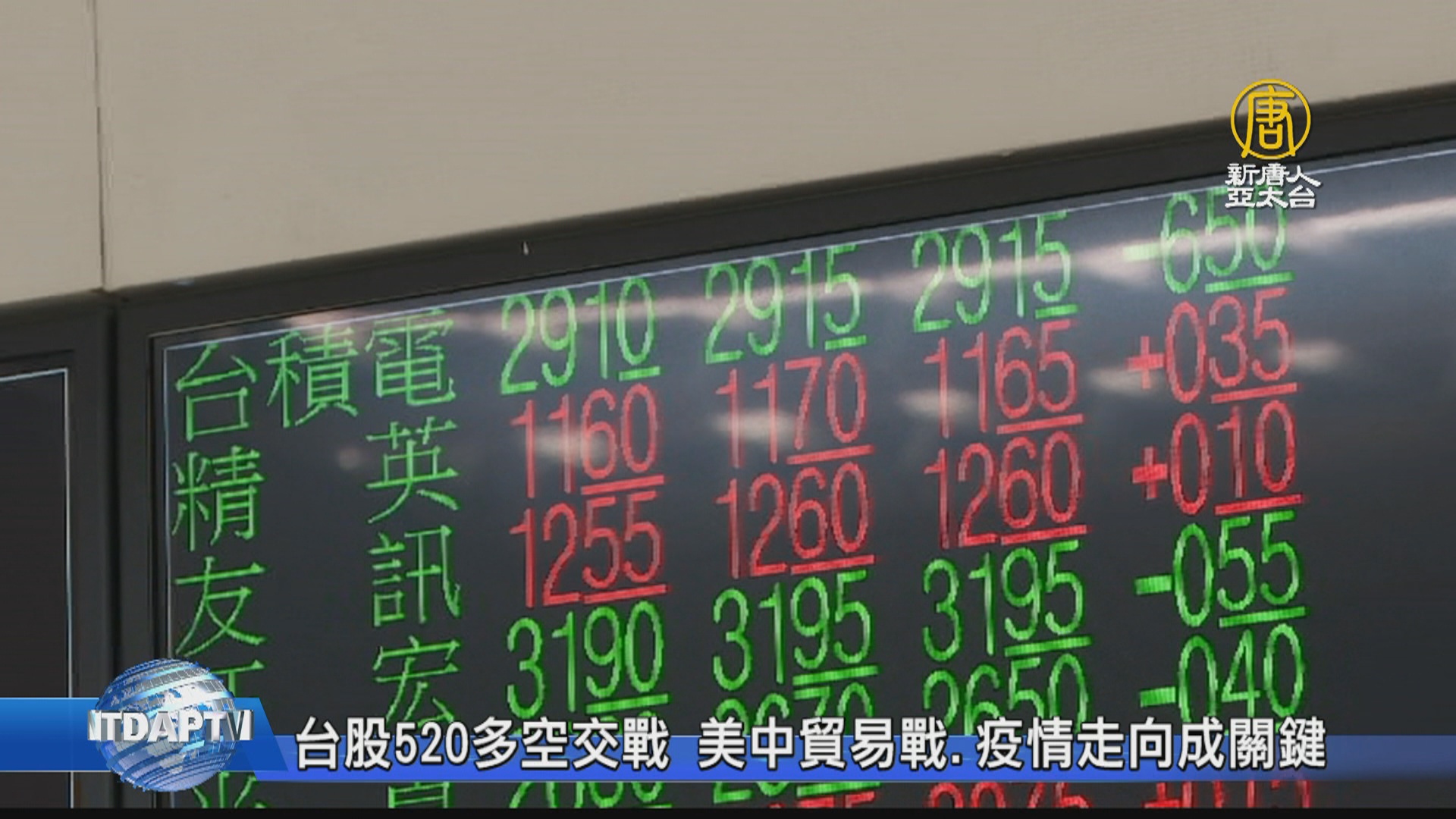 【新唐人亞太台 2020 年 05 月 18 日訊】總統蔡英文,周三520後將開啟第二任新局,不過近期美中衝突加劇,讓台股520行情出現多空交戰,法人分析三大指標,包括中共肺炎疫情進展、台積電在美擴廠,還有美中貿易戰影響,專家則認為目前資金行情尚未退燒,加上國安基金短期不會退場,有助短期市場表現。