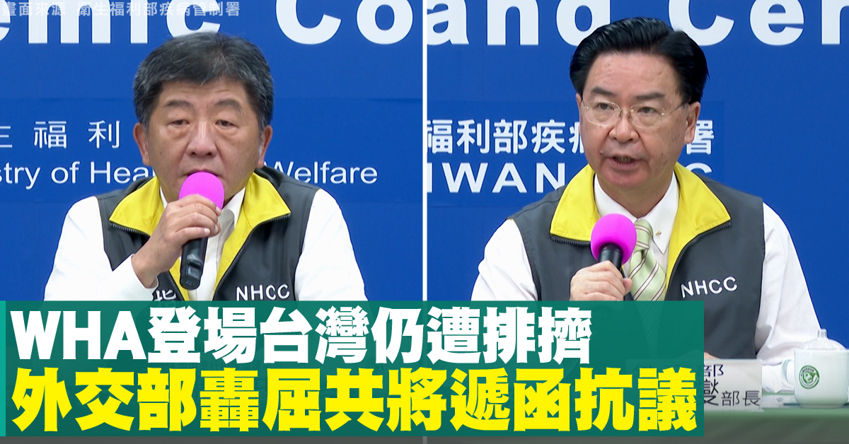 外交部長吳釗燮,親自到疫情指揮中心,和衛福部長陳時中,共同向媒體說明,在中共打壓下,台灣還是無法參加周一登場的WHA。對於防疫台灣模式無法與各國分享,以及台灣無法吸取各國相關經驗,陳時中表示,會向WHO遞交抗議函。