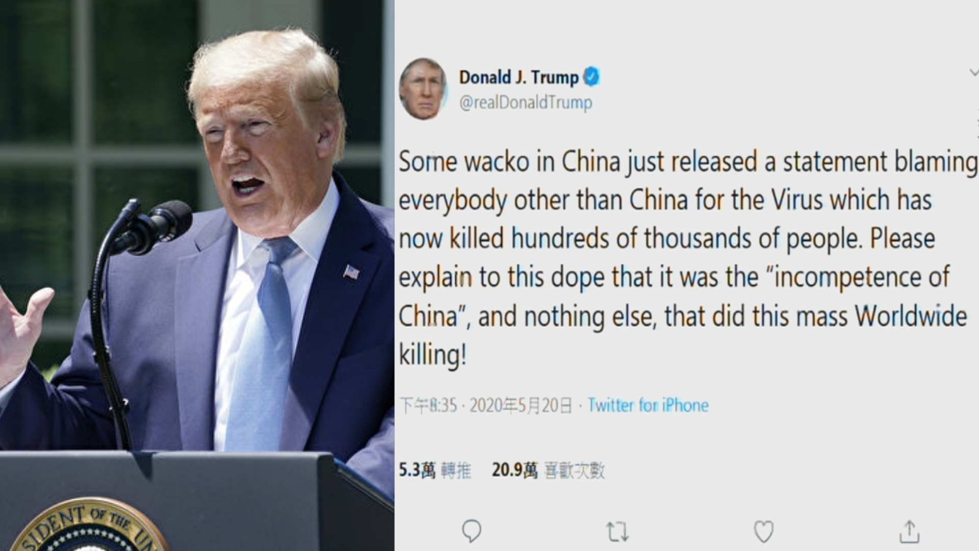 【新唐人亞太台 2020 年 05 月 21 日訊】美國總統川普週三(5月20日)在社交媒體推特上,轟中共無能害全球,並暗指中共發言人趙立堅是笨蛋。他在推文寫道:「中共的某個瘋子剛發表聲明,在病毒上指責所有人、除了中共自己外,該病毒現已殺死數十萬人。請跟這個笨蛋(dope)解釋一下,是『無能的中共』、而不是別人導致的這場『大規模全球殺戮』!」
