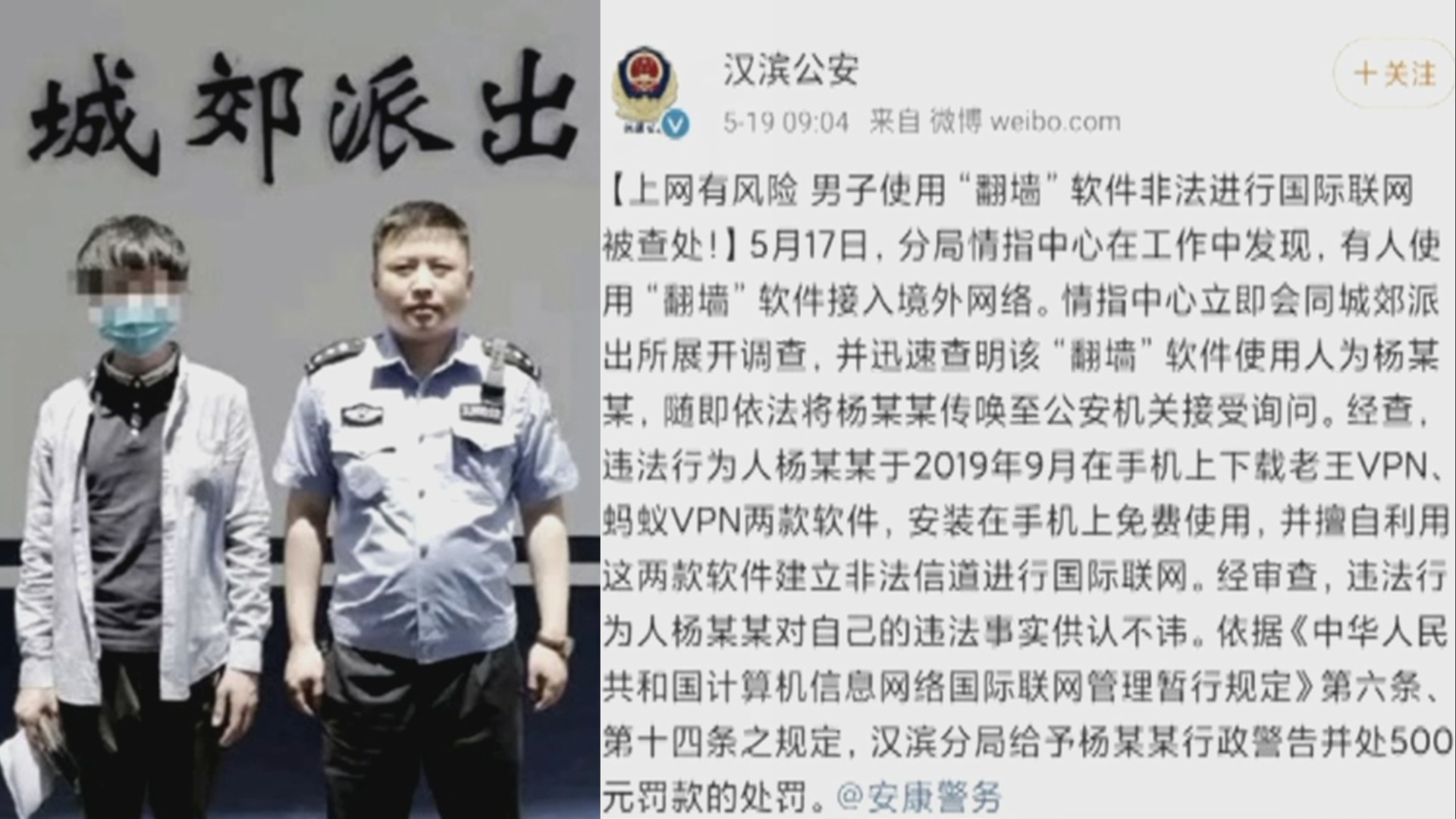 5月19號,陝西安康市公安局漢濱分局的官方微博「漢濱公安」發文說,他們17日發現當地一名男子使用翻牆軟軟件(VPN)進行國際聯網,於是傳喚該男子,並給了他「行政警告」和罰款500元的處罰。消息引發大陸網民不滿。有人說:「人類遷徙已經自由了,上網還不能自由。」也有人質問:「我想知道那外交部發言人是怎麼上外網的?(中國美食網紅)李子柒是怎麼上YouTube的?」還有人將中共外交部發言人華春瑩、趙立堅和《環球時報》主編胡錫進等人在推特發貼的截圖轉發給「漢濱公安」,要求他們跨省抓捕這些官員。