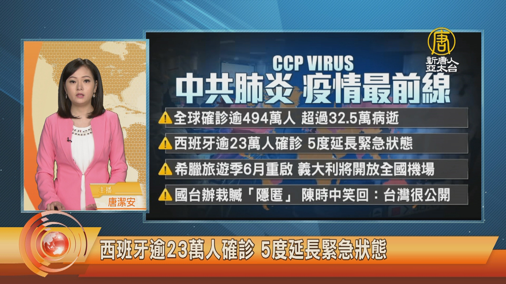 【新唐人亞太台 2020 年 05 月 21 日訊】午報頭條先關心中共肺炎追蹤動態,全球確診超過494萬人,超過32.5萬病逝。西班牙超過23萬人確診,5度延長緊急狀態。希臘旅遊季6月重啟,義大利將開放全國機場。中共國台辦栽贓「隱匿」 陳時中笑回:台灣很公開。