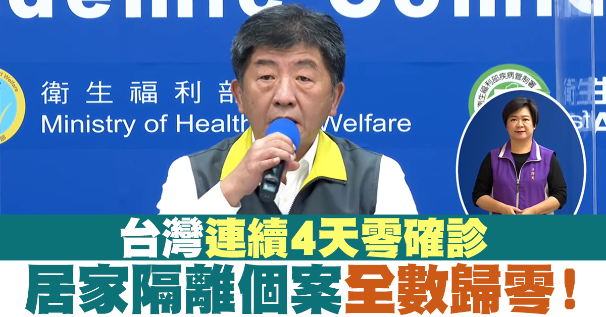 【新唐人亞太台 2020 年 05 月 25 日訊】台灣繼續「加零」中!中央流行疫情指揮中心今(25)日公布無新增病例,其中441例確診,已連4天零確診,連續43天沒有本土出現;居家隔離人數也正式歸零。指揮中心宣布「探病」再放寬中。